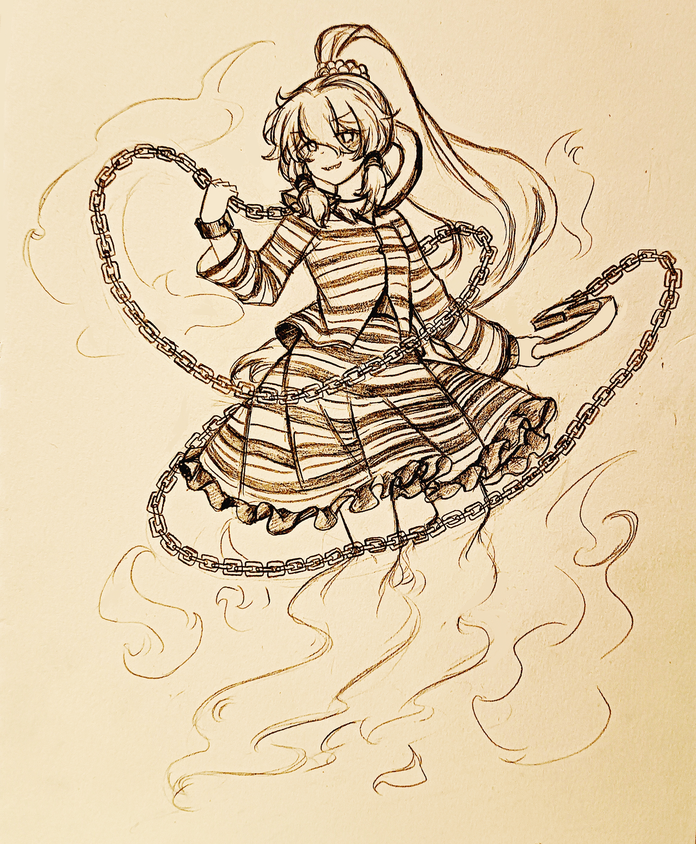 1girl absurdres chain chinese_commentary commentary_request cuffs ghost_tail hair_ornament hair_tubes handcuffs highres holding holding_handcuffs long_hair long_sleeves looking_at_viewer miyadeguchi_mizuchi ponytail prison_clothes shackles shirt skirt skull_hair_ornament smile solo striped_clothes striped_shirt striped_skirt touhou traditional_media wu_yu_wanwan