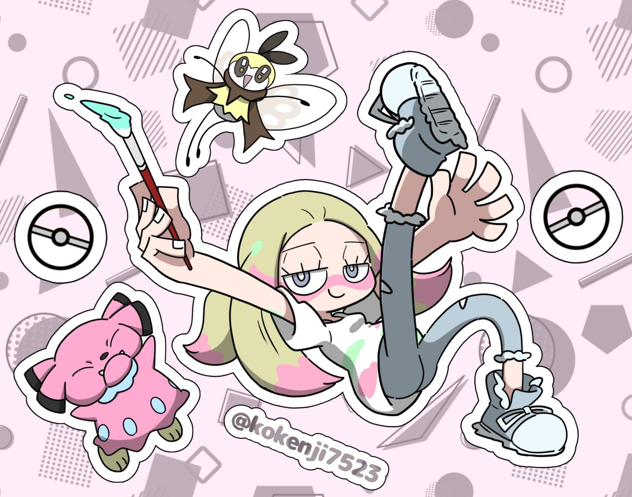 1girl blonde_hair bright_pupils closed_eyes closed_mouth commentary_request eyelashes fangs fingernails full_body gen_2_pokemon gen_7_pokemon grey_eyes grey_pants grey_shoes highres holding holding_paintbrush jitome kokenji7523 leg_up long_hair mina_(pokemon) nintendo open_mouth outline outstretched_arms paintbrush pants poke_ball_symbol pokemon pokemon_(creature) pokemon_sun_and_moon ribombee shirt shoes smile snubbull spread_arms twitter_username white_outline white_pupils white_shirt