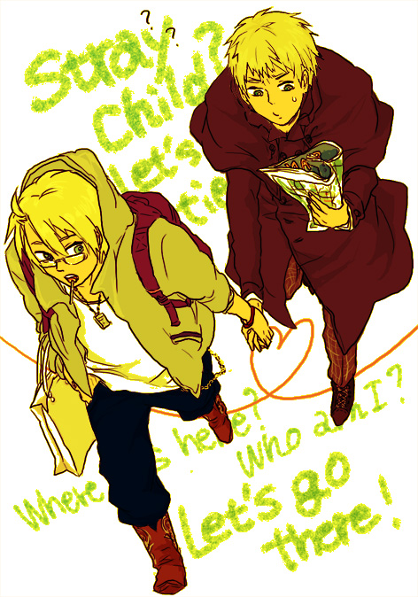 2boys america_(hetalia) axis_powers_hetalia bag black_pants blonde_hair boots bracelet brown_boots brown_coat candy chuu_ni coat commentary_request english_text food food_in_mouth glasses heart holding holding_hands holding_map hood hooded_jacket jacket jewelry lollipop lollipop_in_mouth long_sleeves looking_at_map male_focus map multiple_boys necklace nervous_sweating pants shirt sweat united_kingdom_(hetalia) walking white_background white_shirt