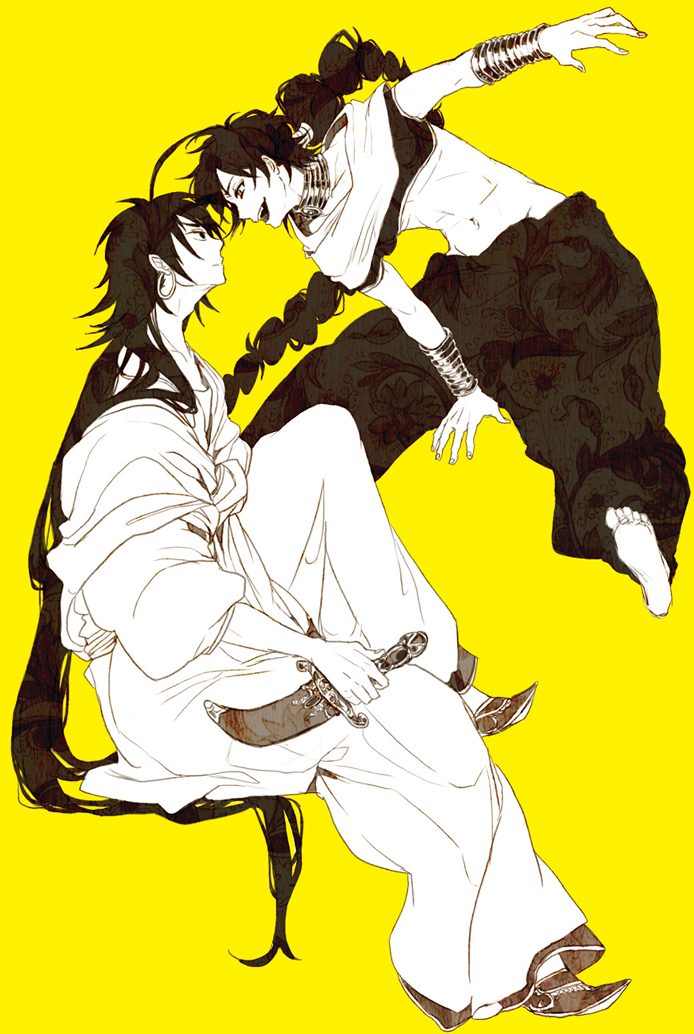 2boys absurdly_long_hair armlet chuu_ni commentary_request dagger earrings greyscale_with_colored_background holding holding_dagger holding_knife holding_weapon hoop_earrings invisible_chair jewelry judal knife long_hair magi_the_labyrinth_of_magic male_focus midriff multiple_boys navel necklace open_mouth pants piercing pointy_shoes profile red_eyes robe shawl shoes sinbad_(magi) sitting very_long_hair weapon