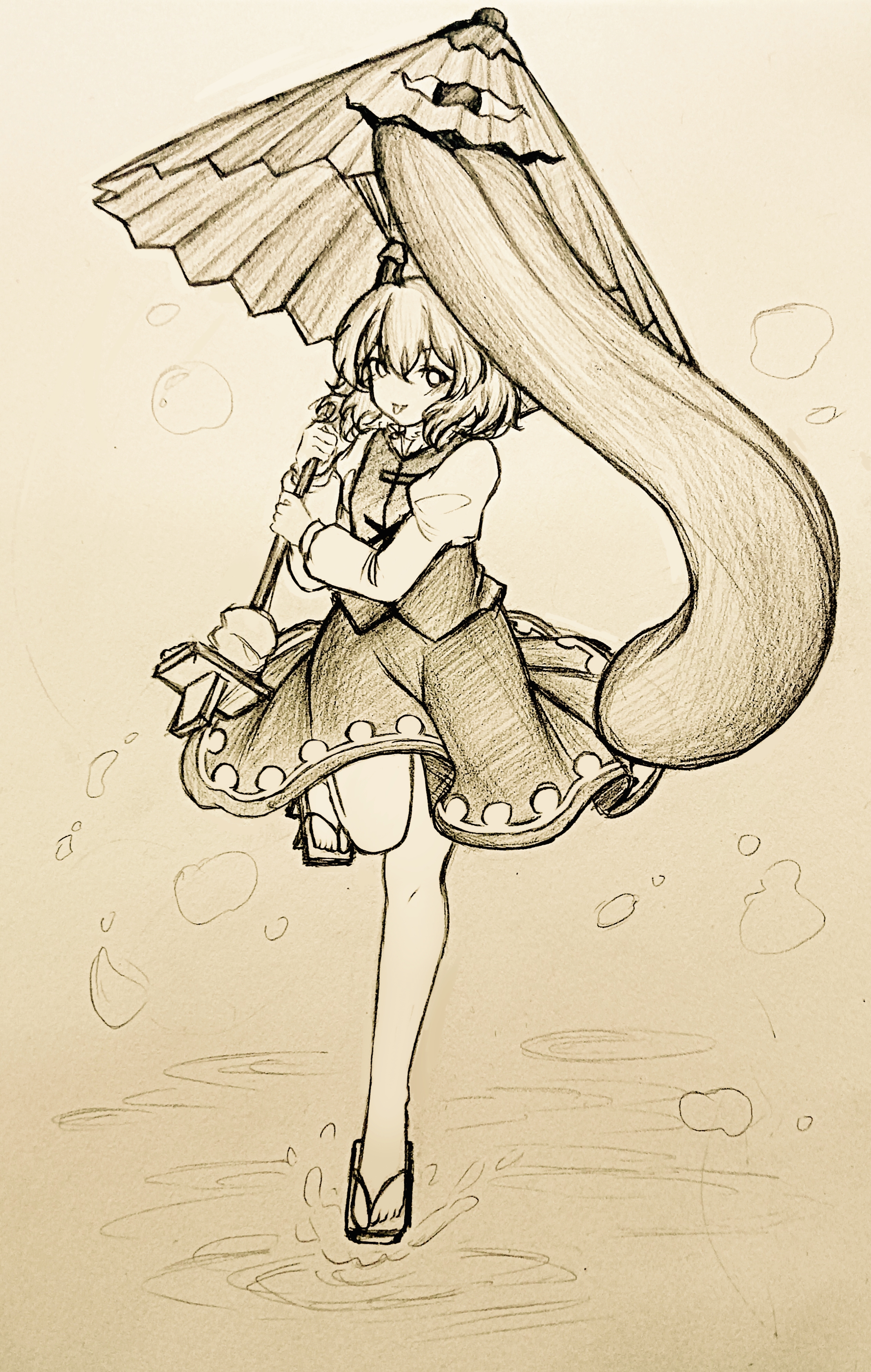 1girl absurdres commentary_request full_body geta greyscale highres holding holding_umbrella juliet_sleeves karakasa_obake long_sleeves looking_at_viewer monochrome puddle puffy_sleeves rain short_hair skirt solo standing standing_on_one_leg tatara_kogasa tongue tongue_out touhou traditional_media umbrella vest wu_yu_wanwan