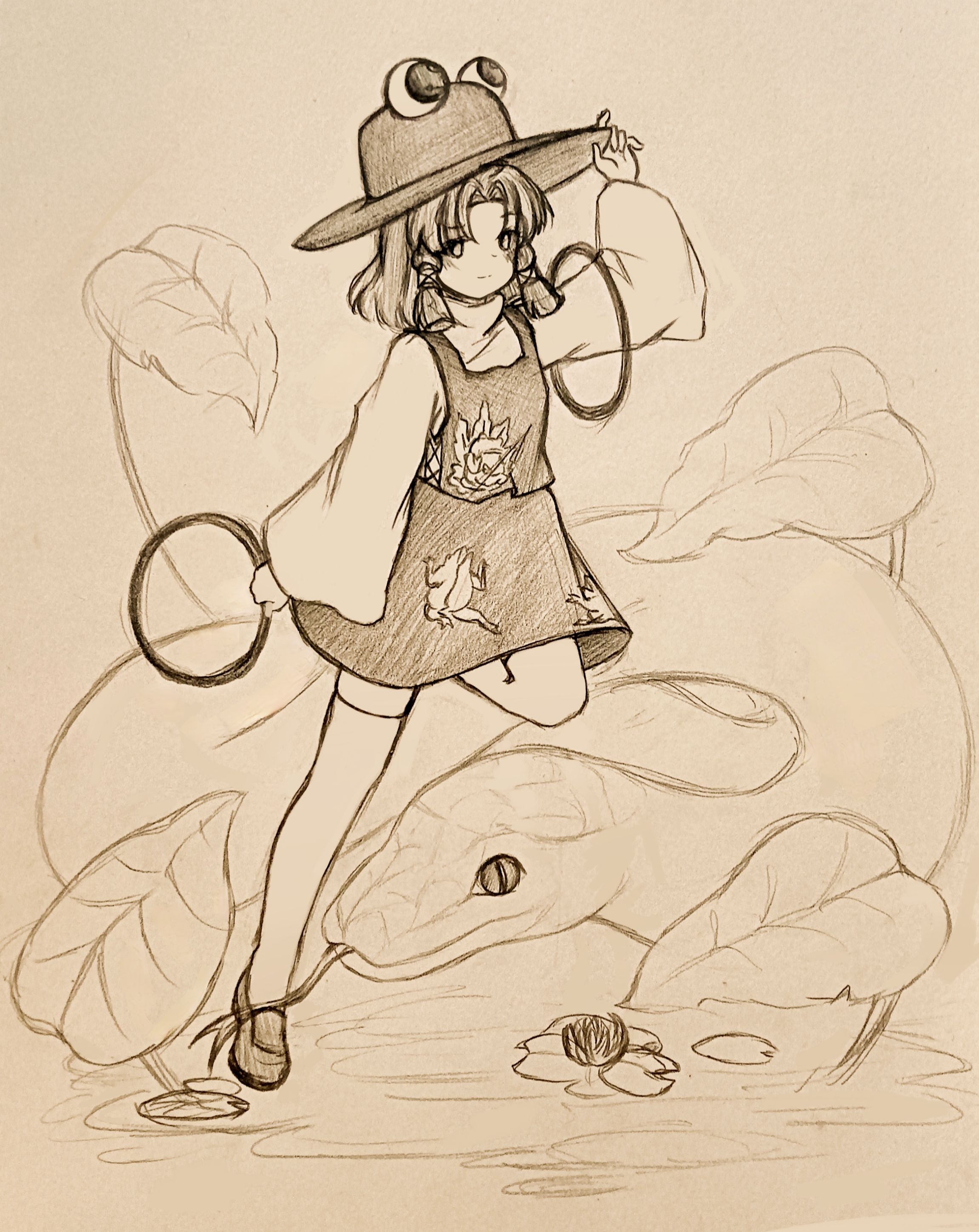 1girl absurdres animal_print chinese_commentary closed_mouth commentary_request frog_print greyscale hand_on_headwear hat highres leaf lily_pad long_sleeves looking_at_viewer monochrome moriya_suwako pond skirt snake thighhighs touhou traditional_media wide_sleeves wu_yu_wanwan