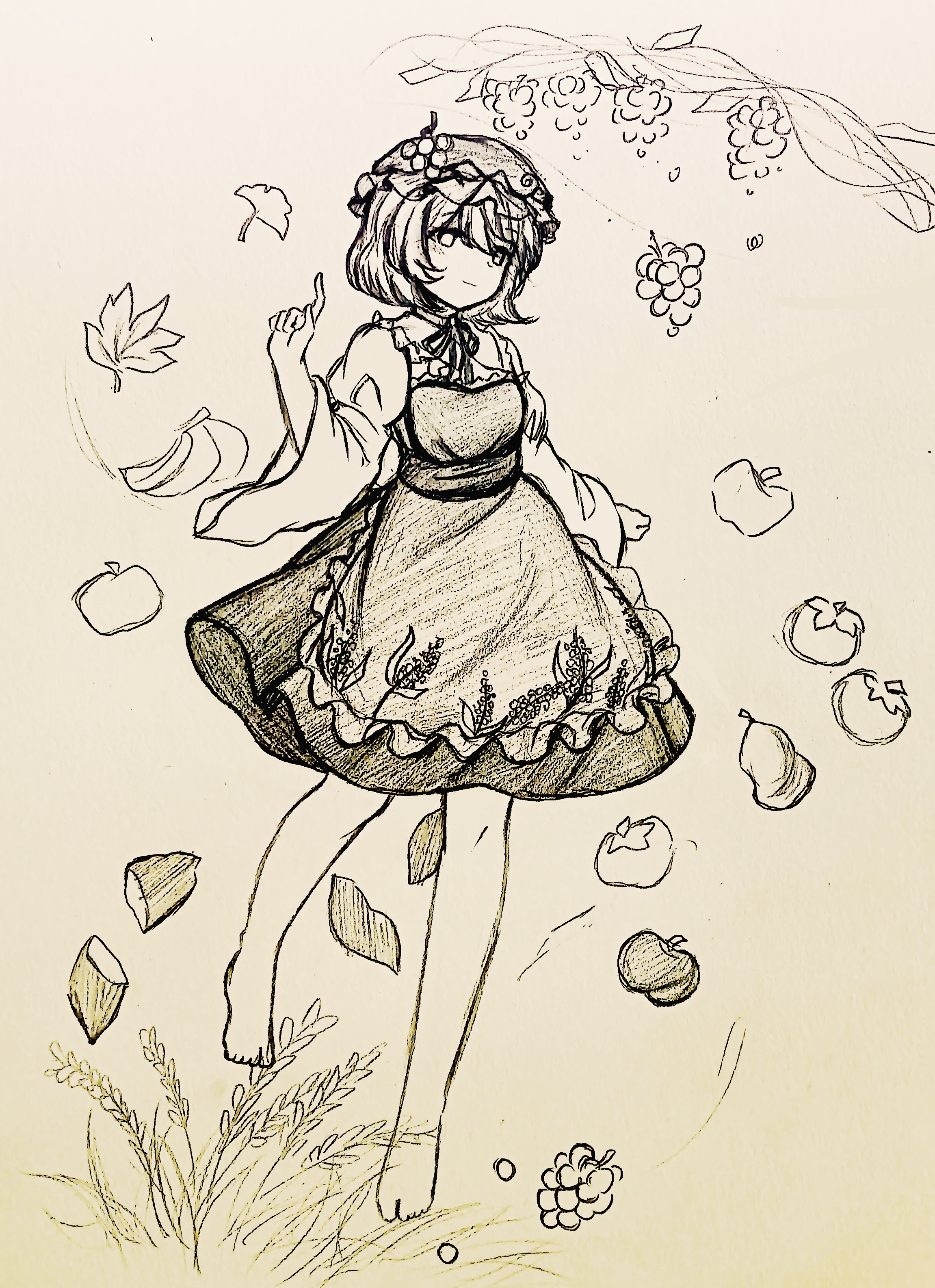 1girl absurdres aki_minoriko apple apron banana barefoot choker closed_mouth commentary_request food fruit full_body ginkgo_leaf grape_hat_ornament grapes hat highres leaf light_smile long_sleeves looking_at_viewer maple_leaf persimmon ribbon_choker shirt short_hair skirt solo sweet_potato toes touhou traditional_media wide_sleeves wu_yu_wanwan