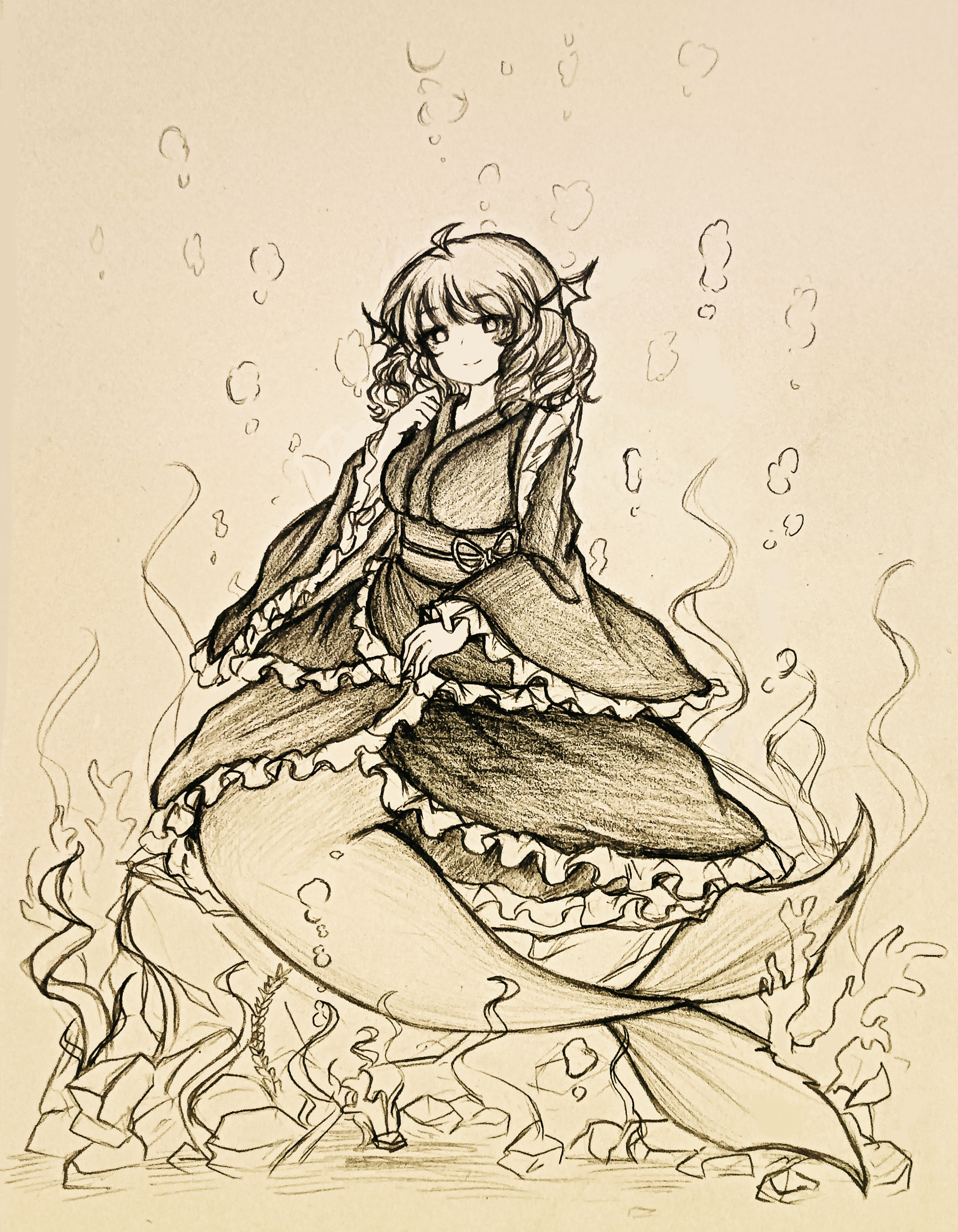 1girl absurdres air_bubble breasts bubble closed_mouth commentary_request drill_hair drill_sidelocks fins frilled_kimono frilled_sleeves frills full_body head_fins highres japanese_clothes kimono long_sleeves medium_breasts medium_hair merfolk mermaid monster_girl obi plant sash sidelocks smile solo touhou traditional_media underwater wakasagihime wide_sleeves wu_yu_wanwan