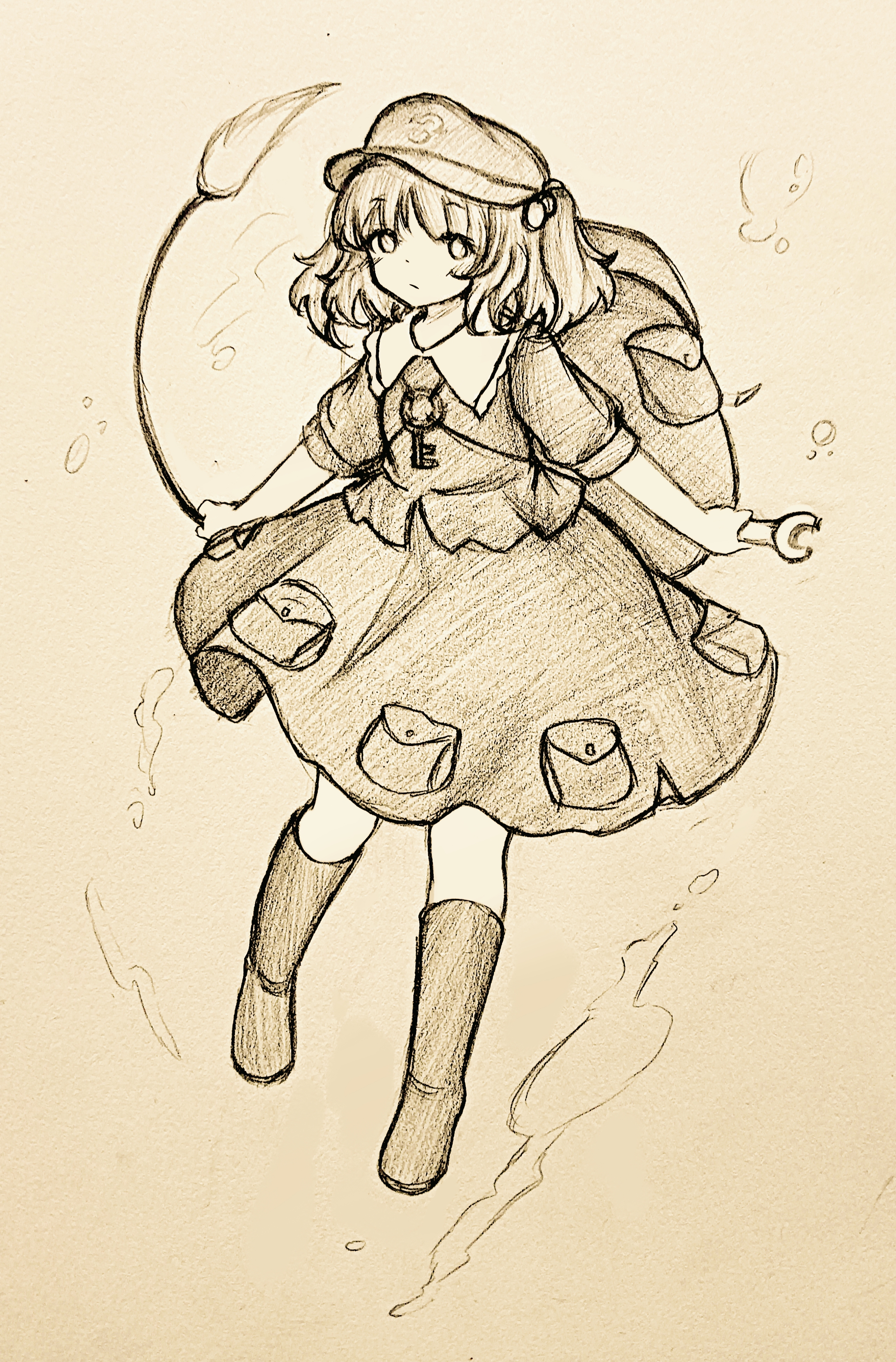 absurdres backpack bag boots cattail closed_mouth commentary_request full_body greyscale hair_bobbles hair_ornament hat highres holding holding_wrench kawashiro_nitori key looking_at_viewer medium_hair mob_cap monochrome plant pocket shirt simple_background skirt touhou traditional_media two_side_up wrench wu_yu_wanwan