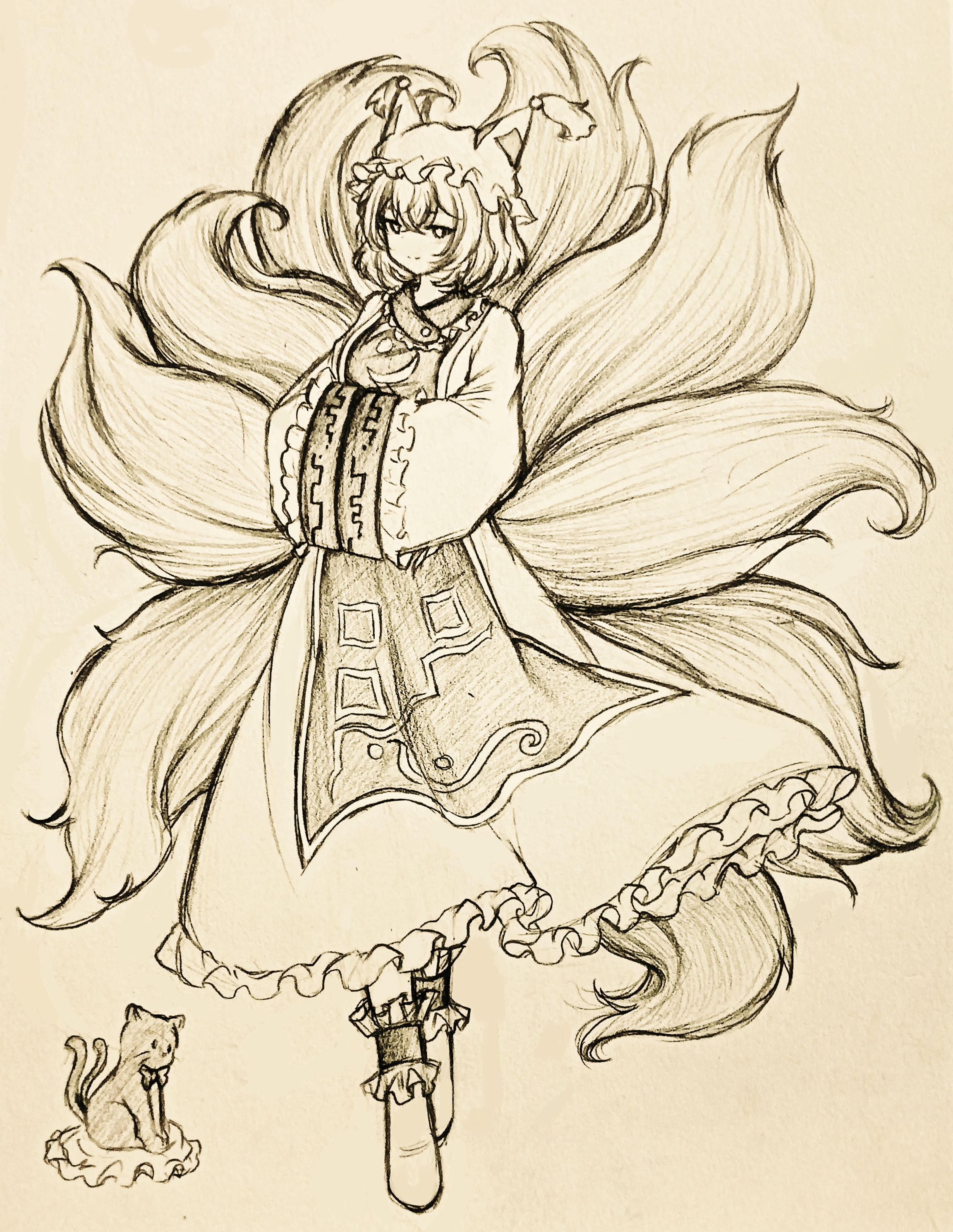 1girl absurdres animal_hat animalization breasts cat chen chen_(cat) chinese_commentary closed_mouth commentary_request dress fox_tail frilled_dress frills full_body hat highres kitsune kyuubi long_sleeves looking_at_viewer medium_breasts mob_cap multiple_tails short_hair tabard tail touhou traditional_media two_tails wide_sleeves wu_yu_wanwan yakumo_ran
