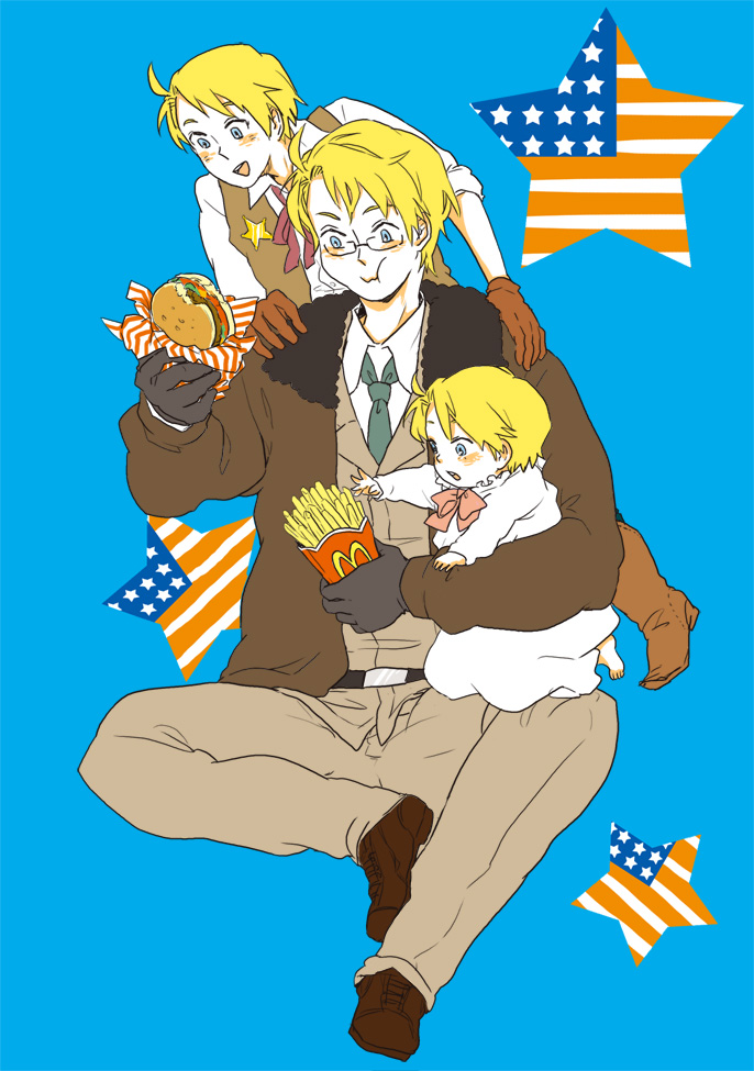 3boys america_(hetalia) american_flag axis_powers_hetalia baby belt black_belt black_gloves blonde_hair blue_background blue_eyes blue_necktie blush bow brown_gloves brown_jacket brown_pants brown_shoes brown_vest burger chewing chuu_ni closed_mouth collared_shirt commentary_request dress eating food food_wrapper french_fries glasses gloves hands_on_another's_shoulders holding holding_burger holding_food jacket long_sleeves male_focus mcdonald's multiple_boys multiple_persona necktie open_clothes open_jacket open_mouth pants reaching red_bow sheriff_badge shirt shoes sitting sleeves_rolled_up star_(symbol) time_paradox triangle_mouth vest white_dress white_shirt wing_collar