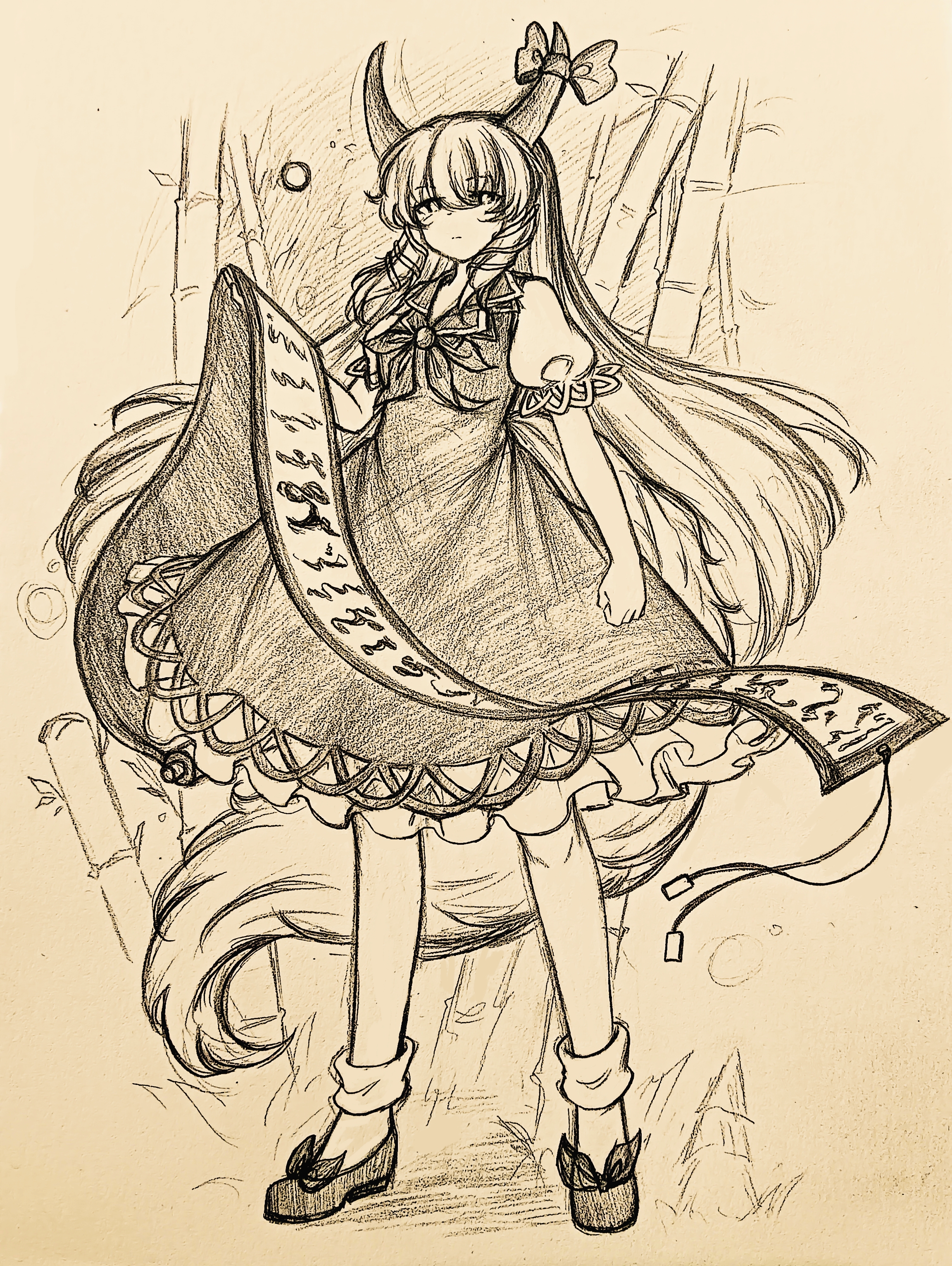 1girl absurdres bamboo bamboo_forest bobby_socks chinese_commentary closed_mouth commentary_request dress ex-keine forest full_body greyscale highres holding holding_scroll horns kamishirasawa_keine long_hair looking_at_viewer monochrome nature scroll shoes short_sleeves sidelocks socks solo standing tail touhou traditional_media wu_yu_wanwan