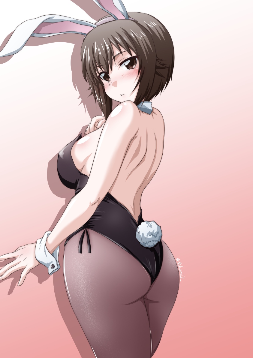 1girl animal_ear_hairband animal_ears ass birthday black_leotard blush breasts brown_eyes brown_hair clenched_teeth commentary_request detached_collar eyes_visible_through_hair fake_animal_ears fake_tail girls_und_panzer gradient_background hair_between_eyes hairband happy_birthday large_breasts leotard looking_at_viewer looking_back nishizumi_maho one-hour_drawing_challenge open_mouth pantyhose playboy_bunny rabbit_ears rabbit_tail short_hair sideboob solo strapless strapless_leotard tail teeth wrist_cuffs yts_takana