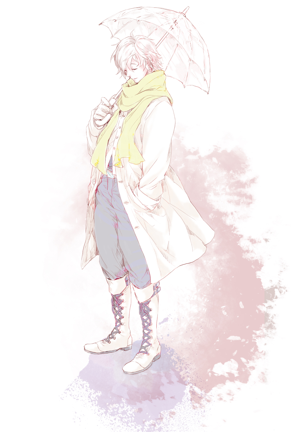 1boy arm_up boots chuu_ni clear_(dramatical_murder) closed_eyes coat commentary_request dramatical_murder full_body green_scarf grey_pants hand_in_pocket highres holding holding_umbrella lace-up_boots long_sleeves looking_down male_focus pants parted_bangs scarf short_hair solo standing transparent transparent_umbrella umbrella white_boots white_coat white_hair