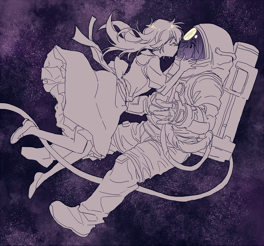 2girls astronaut boots closed_eyes commentary_request dress face-to-face floating frilled_dress frills gloves hands_on_another's_head helmet imminent_kiss long_hair long_sleeves maribel_hearn multiple_girls pants re_ghotion shoes short_sleeves space space_helmet tagme touhou usami_renko yuri