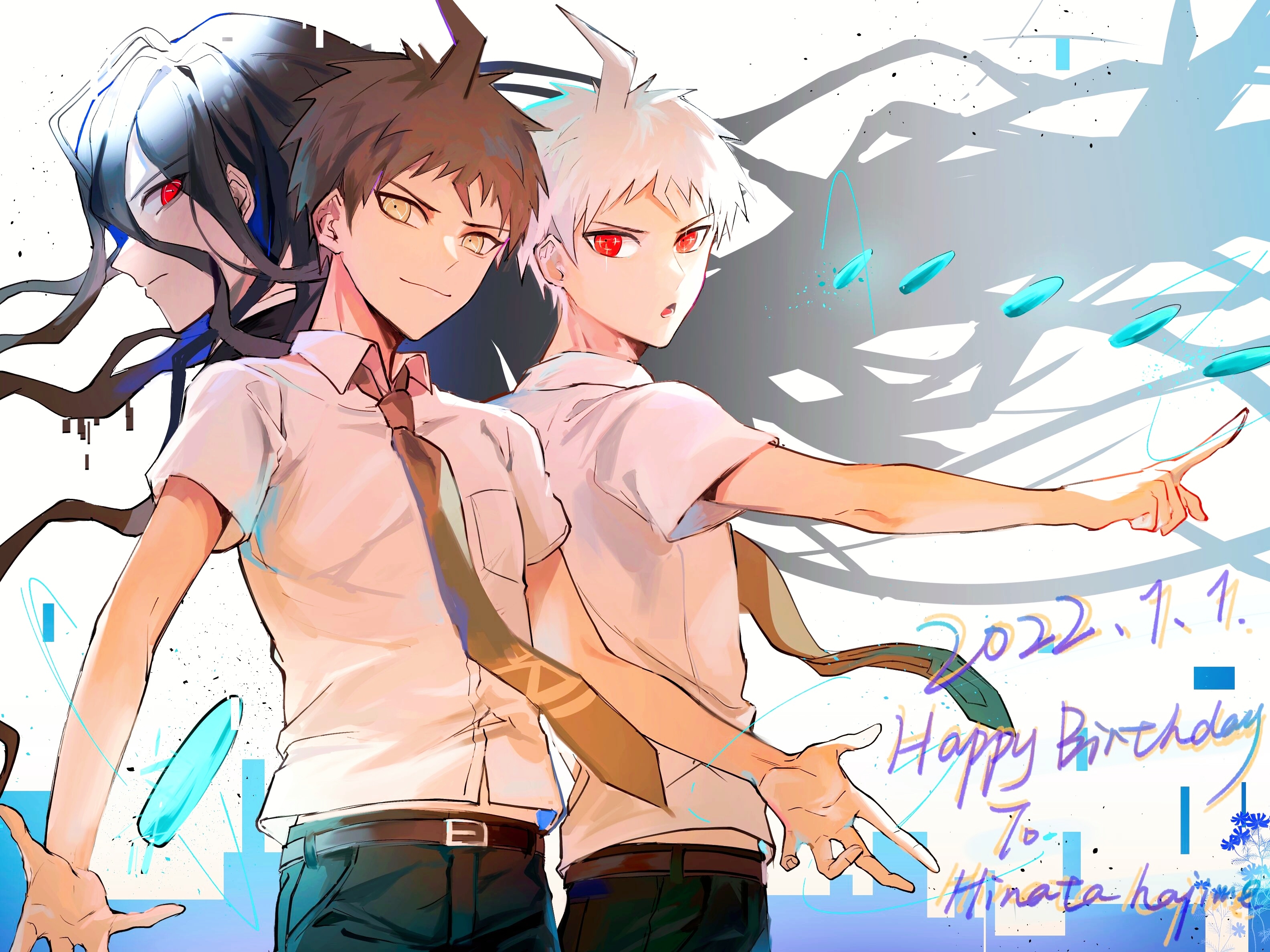 3boys ahoge belt belt_buckle binxngchng1 black_hair black_pants breast_pocket brown_belt brown_hair brown_necktie buckle character_name chinese_commentary closed_mouth collared_shirt commentary_request danganronpa_(series) dated english_text hair_between_eyes happy_birthday highres hinata_hajime hinata_hajime_(awakened) kamukura_izuru long_hair male_focus multiple_boys multiple_persona necktie open_mouth pants pocket red_eyes shirt short_hair short_sleeves smile spoilers v-shaped_eyebrows very_long_hair white_hair white_shirt wing_collar yellow_eyes