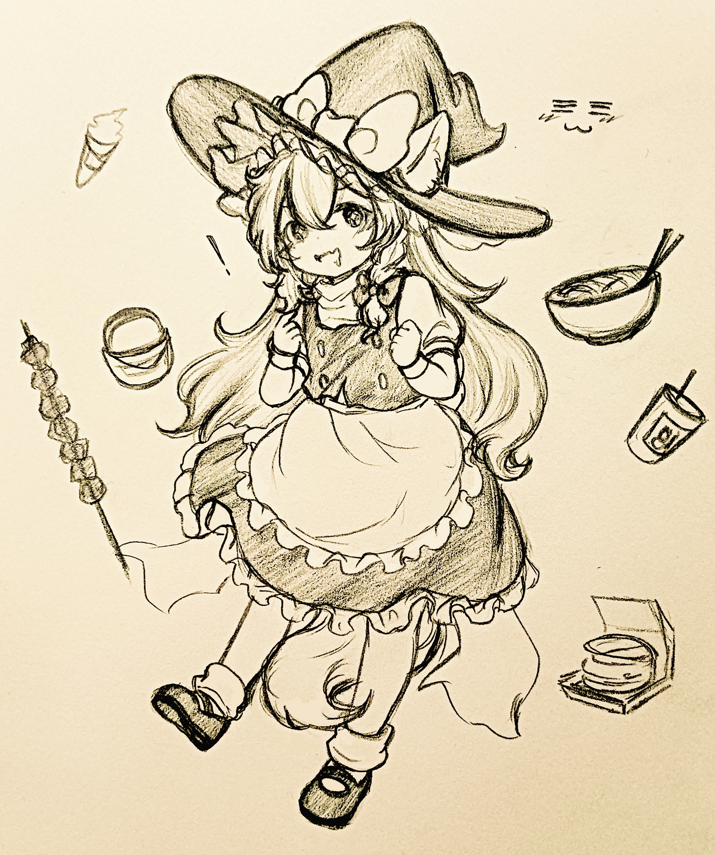 +_+ 1girl :3 =_= absurdres animal_ear_fluff animal_ears apron bow bowl braid chinese_commentary commentary_request dango dog_ears dog_girl dog_tail food frilled_skirt frills full_body hair_bow hat hat_bow highres ice_cream ice_cream_cone kirisame_marisa long_hair mary_janes open_mouth puffy_short_sleeves puffy_sleeves shoes short_sleeves side_braid single_braid skewer skirt smile socks solo tail touhou traditional_media very_long_hair vest wagashi waist_apron witch_hat wu_yu_wanwan