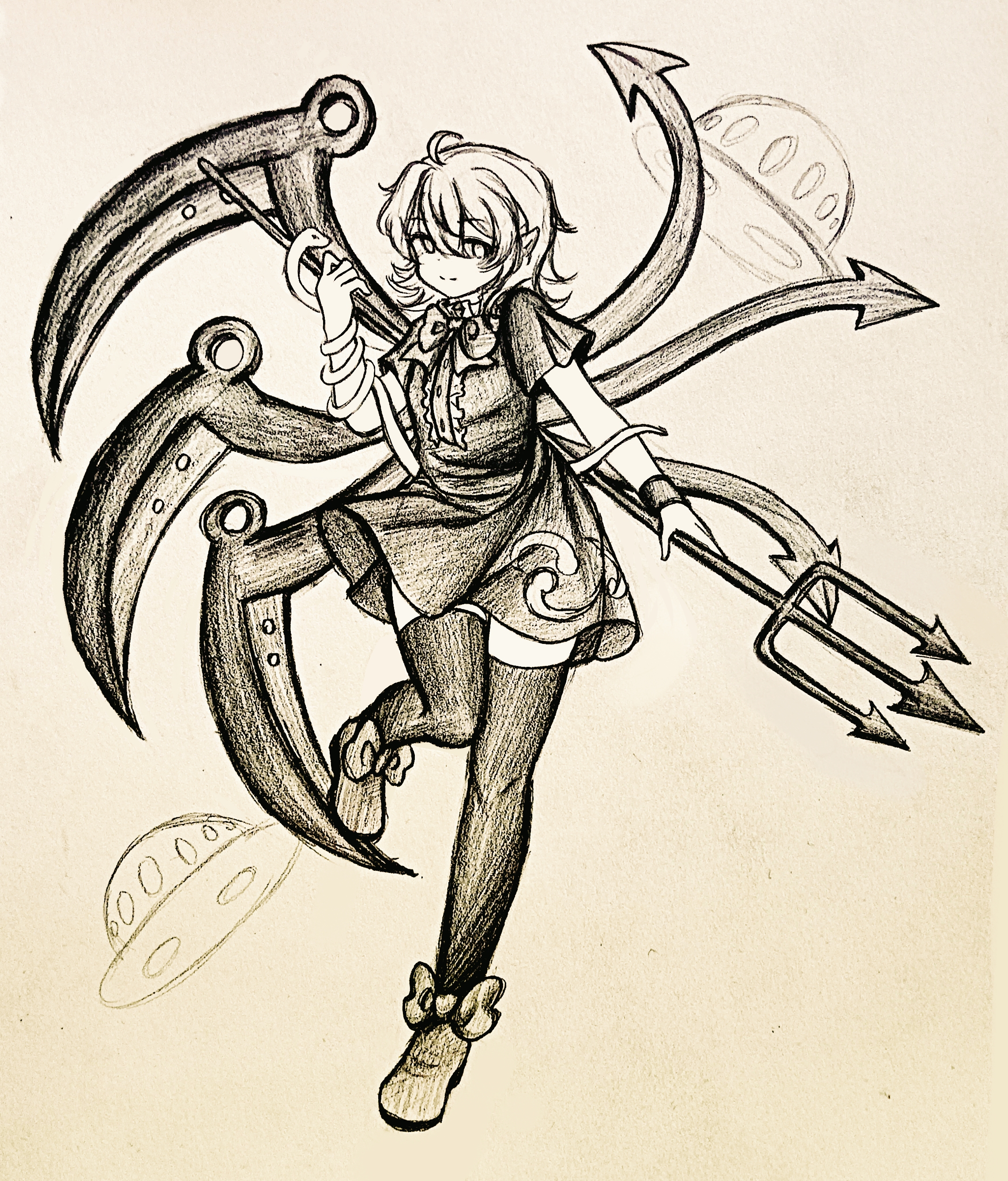 1girl absurdres asymmetrical_wings bow bowtie closed_mouth commentary_request full_body highres holding holding_polearm holding_weapon houjuu_nue leg_up looking_at_viewer medium_hair pointy_ears polearm shoes short_sleeves smile snake solo thighhighs touhou traditional_media trident ufo weapon wings wu_yu_wanwan