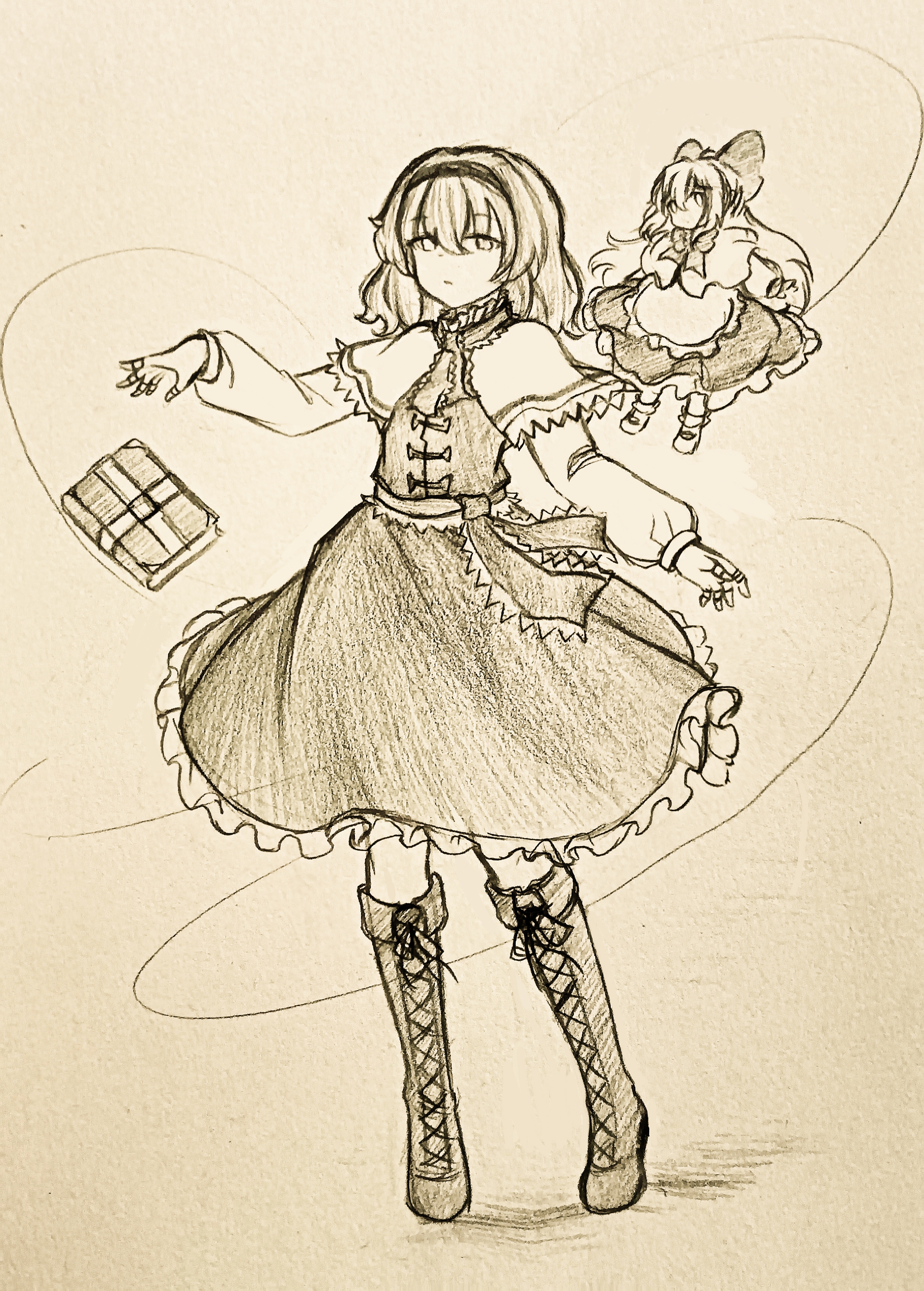1girl absurdres alice_margatroid book boots bow capelet chinese_commentary closed_mouth commentary_request doll dress frilled_dress frills full_body grimoire grimoire_of_alice hair_bow hairband highres jewelry knee_boots lace-up_boots long_sleeves medium_hair puppet_rings puppet_strings ring shanghai_doll solo touhou traditional_media wu_yu_wanwan