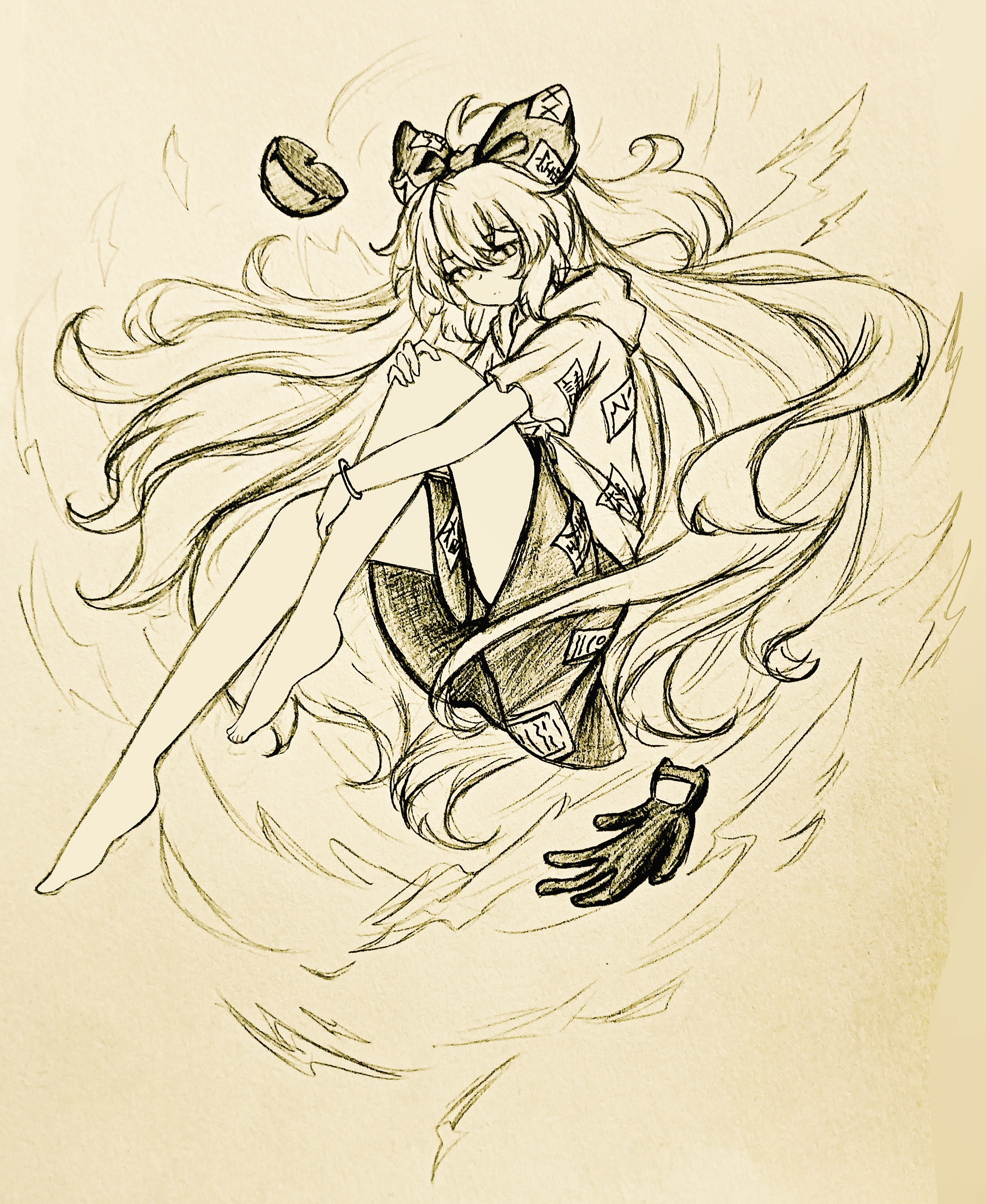 1girl absurdres bangle barefoot bow bowl bracelet closed_mouth commentary_request full_body hair_bow highres hood hoodie jewelry long_hair looking_at_viewer short_sleeves skirt solo stuffed_animal stuffed_cat stuffed_toy touhou traditional_media very_long_hair wu_yu_wanwan yorigami_shion