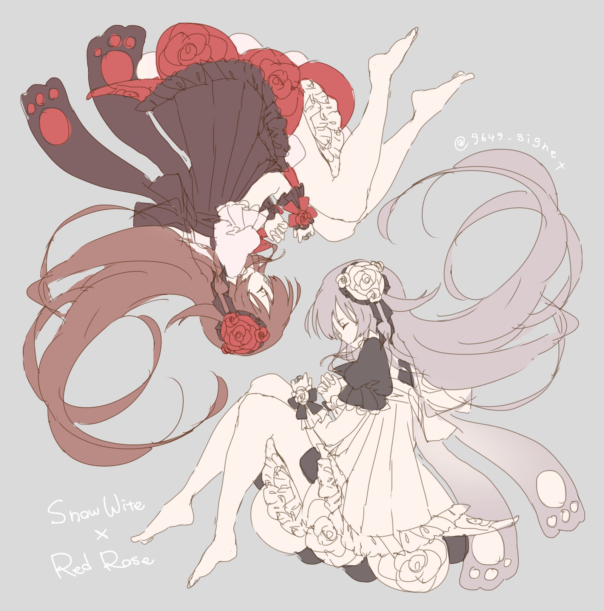 2girls az_9649 barefoot black_dress black_shirt character_name closed_eyes commentary_request dress flat_color grimms_notes hair_spread_out highres long_hair lying multiple_girls own_hands_together profile puffy_short_sleeves puffy_sleeves red_rose_(grimms_notes) shirt short_sleeves simple_background white_dress white_rose_(grimms_notes) white_rose_(original)_(grimms_notes) white_shirt