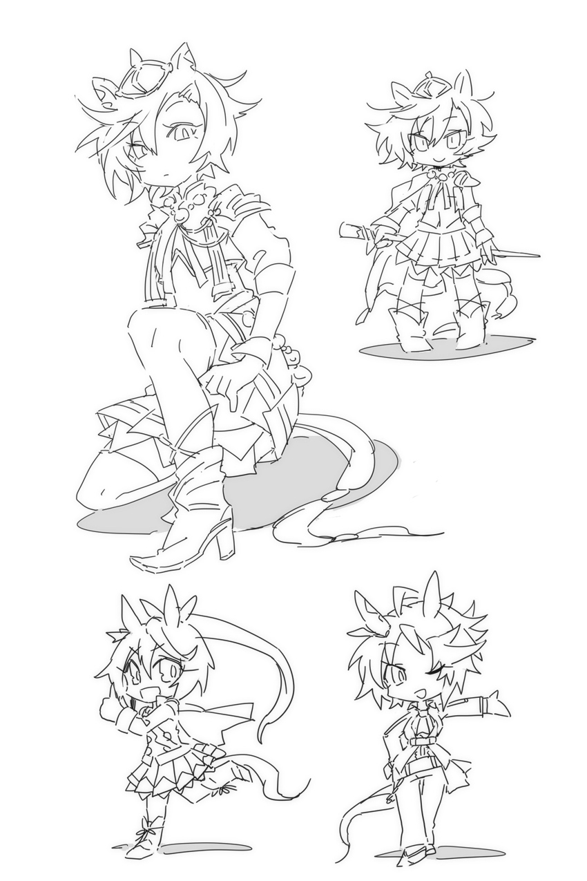 3girls :d ;d animal_ears beer_hsk boots closed_mouth commentary_request floating_hair fuji_kiseki_(umamusume) greyscale hair_ribbon high_heel_boots high_heels highres horse_ears horse_girl horse_tail jacket long_hair long_sleeves monochrome multiple_girls multiple_views one_eye_closed open_clothes open_jacket open_mouth outstretched_arm pleated_skirt ponytail puffy_short_sleeves puffy_sleeves ribbon running shadow shirt short_hair short_sleeves skirt smile standing t.m._opera_o_(o_sole_suo!)_(umamusume) t.m._opera_o_(umamusume) tail thighhighs thighhighs_under_boots tokai_teio_(peak_joy)_(umamusume) tokai_teio_(umamusume) umamusume very_long_hair white_background