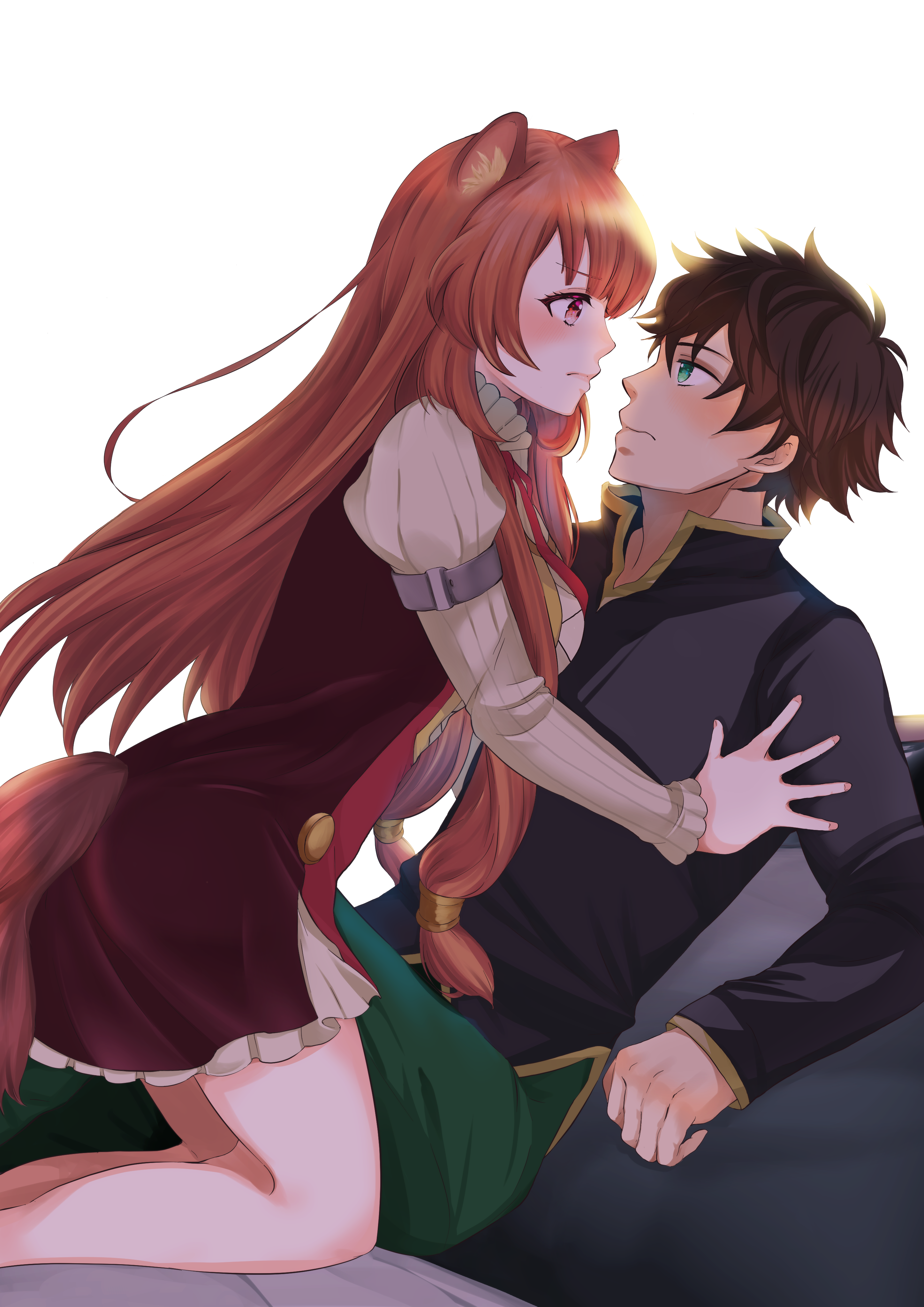 1boy 1girl absurdres animal_ear_fluff animal_ears assertive_female bare_legs black_dress black_hair black_shirt blush breasts brown_hair closed_mouth collared_shirt commentary_request commission dress eye_contact feet_out_of_frame frilled_dress_collar from_side green_eyes green_pants hair_tubes hetero high_collar highres iwatani_naofumi kasakasako kneeling layered_dress long_hair long_sleeves looking_at_another lying medium_breasts messy_hair metal_arm_cuffs metal_hair_tubes neck_ribbon on_back open_collar pants pink_hair pinstripe_dress pinstripe_pattern pleated_dress raccoon_ears raccoon_girl raccoon_tail raphtalia red_dress red_ribbon ribbon shirt short_dress short_hair simple_background skeb_commission sleeveless sleeveless_dress straight_hair tail tate_no_yuusha_no_nariagari two-tone_dress white_background white_dress yukadon