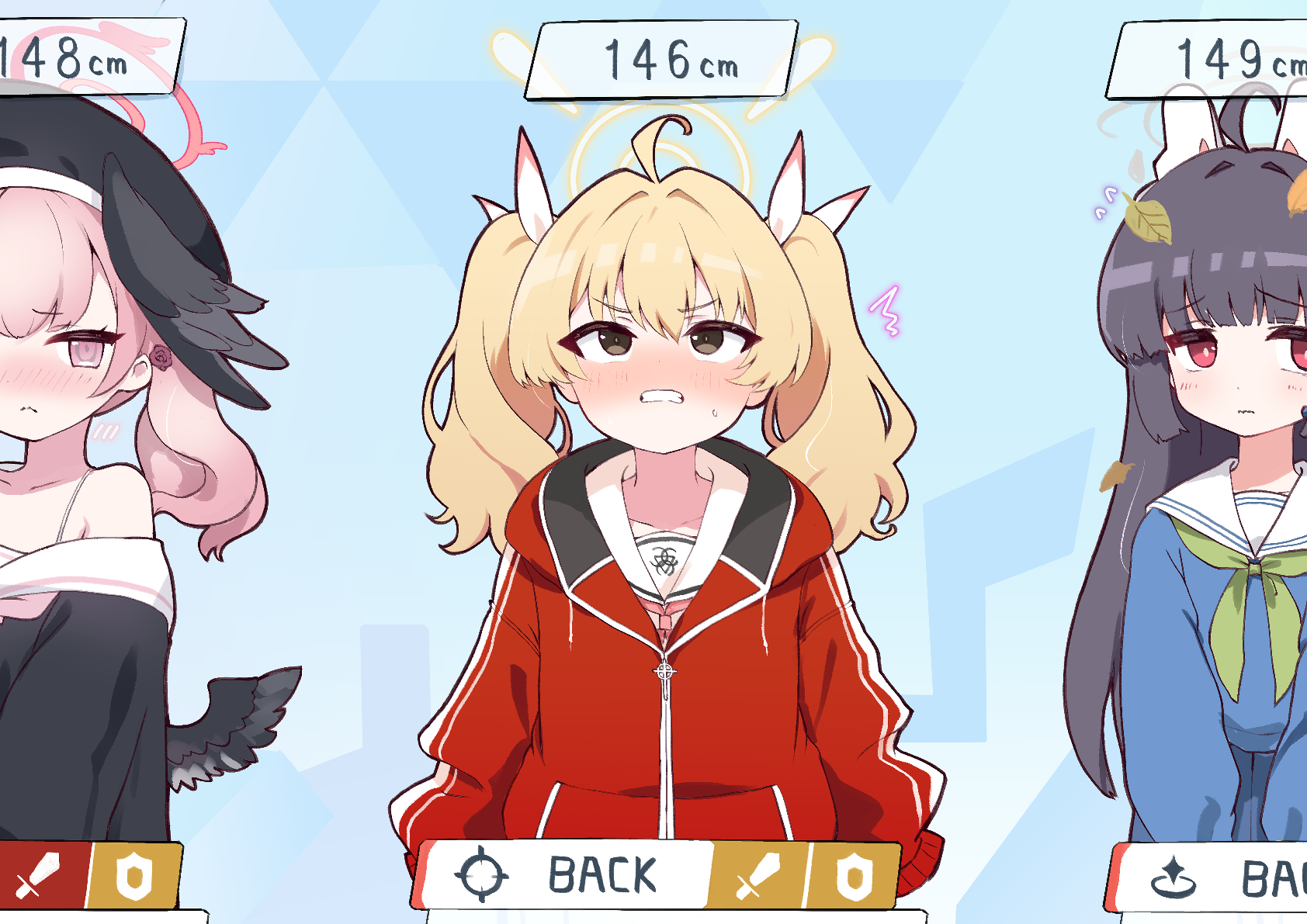 3girls ^^^ ahoge arms_at_sides bare_shoulders beret black_hair black_hat black_shirt black_wings blonde_hair blue_archive blue_background blue_shirt blush bra_strap brown_eyes clenched_teeth closed_mouth collarbone cross english_text feathered_wings female_focus flat_chest flying_sweatdrops green_neckerchief grey_halo hair_ribbon halo hat head_wings headgear height height_conscious hood hood_down jacket koharu_(blue_archive) kurosaki_kousuke leaf leaf_on_head long_hair long_sleeves looking_up low_wings matching_hair/eyes mini_wings miyu_(blue_archive) multiple_girls multiple_wings neckerchief nose_blush pink_eyes pink_hair red_halo red_jacket ribbon sailor_collar school_uniform serafuku shirt sidelocks solo_focus standing straight-on sweat teeth twintails upper_body v-shaped_eyebrows wavy_mouth white_ribbon white_sailor_collar white_shirt wings yellow_halo yoshimi_(blue_archive) zipper_pull_tab