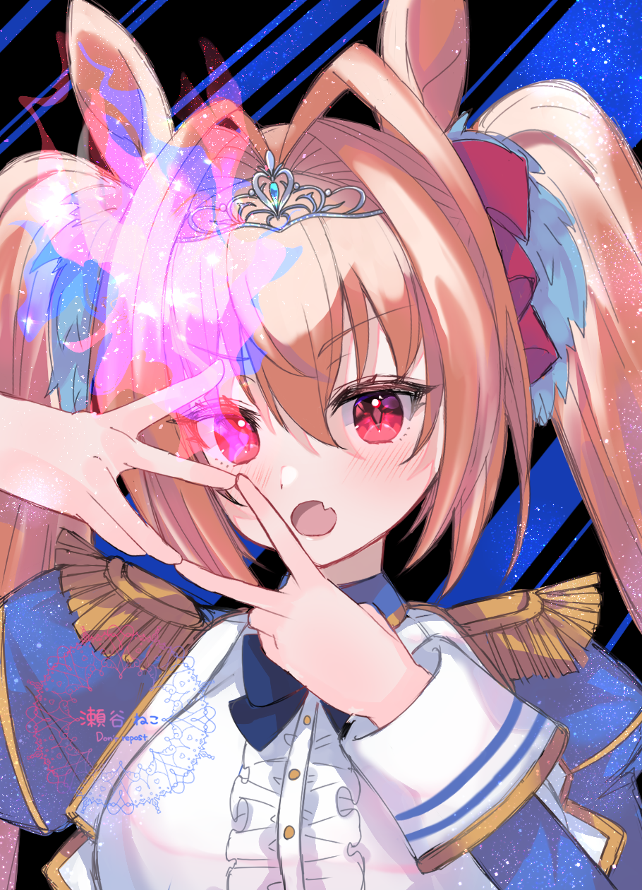 1girl animal_ears blue_bow blue_bowtie blue_jacket blush bow bowtie breasts brown_hair center_frills collared_shirt commentary_request daiwa_scarlet_(peak_blue)_(umamusume) daiwa_scarlet_(umamusume) epaulettes eye_trail fang frills glowing glowing_eye hair_intakes highres horse_ears horse_girl jacket large_breasts light_trail long_hair long_sleeves looking_at_viewer open_mouth red_eyes setani_neco shirt skin_fang solo tiara twintails umamusume upper_body very_long_hair white_shirt
