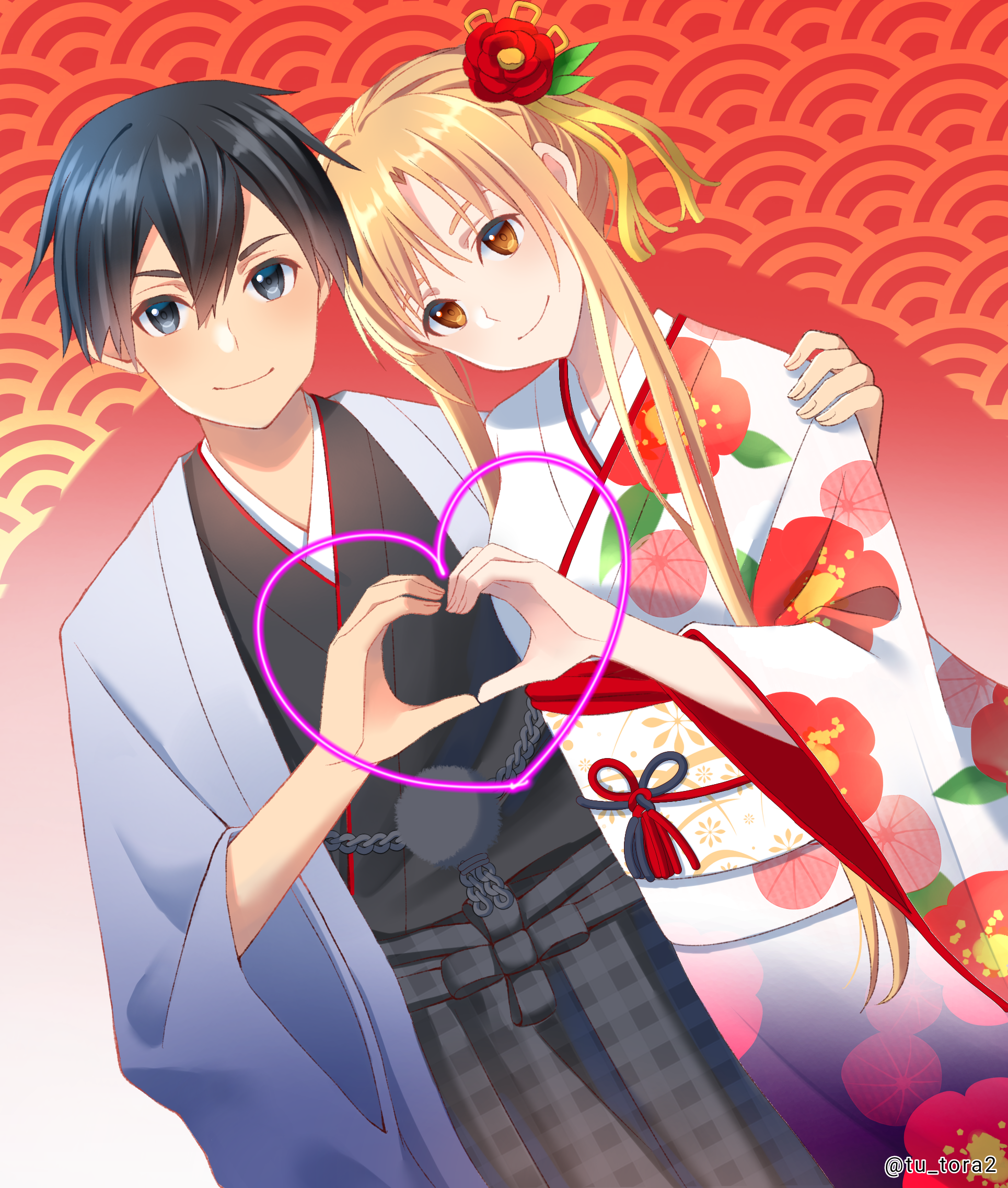 1boy 1girl alternate_costume artist_name asuna_(sao) black_hair black_kimono blue_kimono breasts brown_eyes brown_hair closed_mouth commentary_request couple cowboy_shot dutch_angle floral_print floral_print_kimono gradient_background gradient_clothes gradient_kimono grey_eyes hand_on_another's_shoulder head_tilt heart heart_hands heart_hands_duo hetero highres japanese_clothes kimono kirito looking_at_viewer orange_background print_kimono red_background sash small_breasts smile straight-on sword_art_online tu_tora2 twitter_username watermark white_background white_kimono white_sash