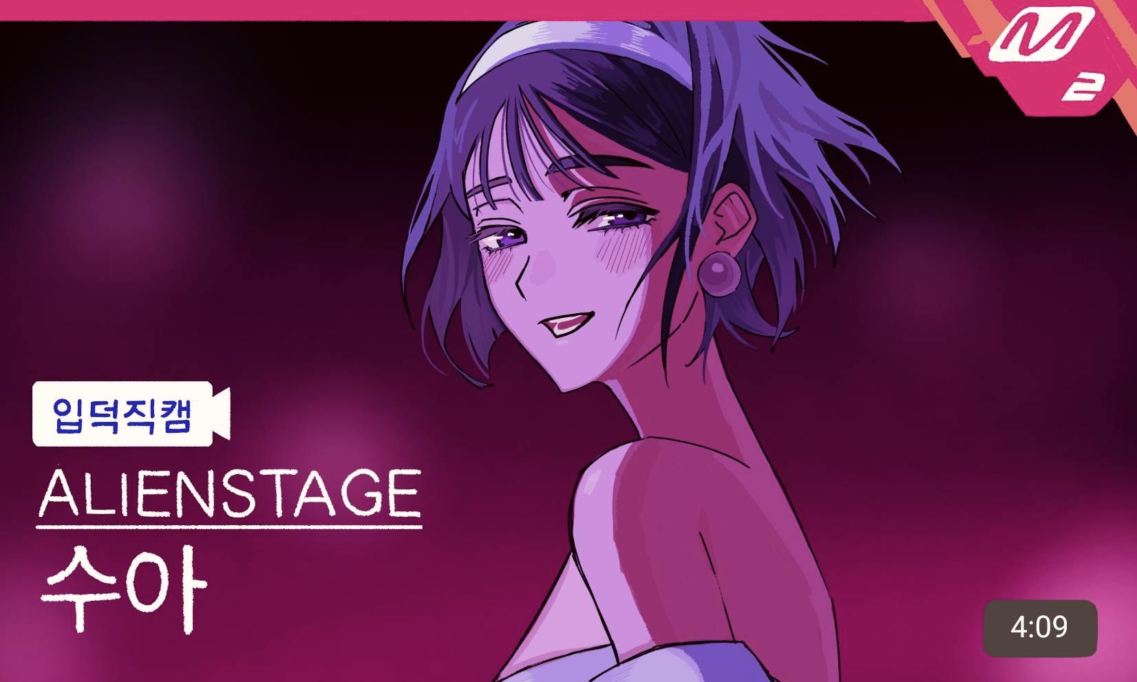 1girl alien_stage black_hair blush character_name commentary copyright_name cover earrings english_text fake_cover from_side hairband highres jcqllrw83843 jewelry korean_text open_mouth pearl_earrings pink_background purple_eyes short_hair smile solo sphere_earrings sua_(alien_stage) white_hairband