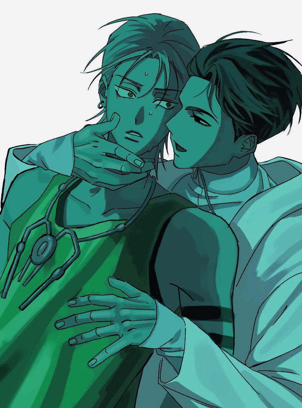 2boys alien_stage armband black_hair coat commentary green_tank_top grey_hair hand_on_another's_face highres ivan_(alien_stage) jcqllrw83843 male_focus multiple_boys open_mouth parted_lips shirt short_hair sweat tank_top till_(alien_stage) very_short_hair white_background white_coat white_shirt
