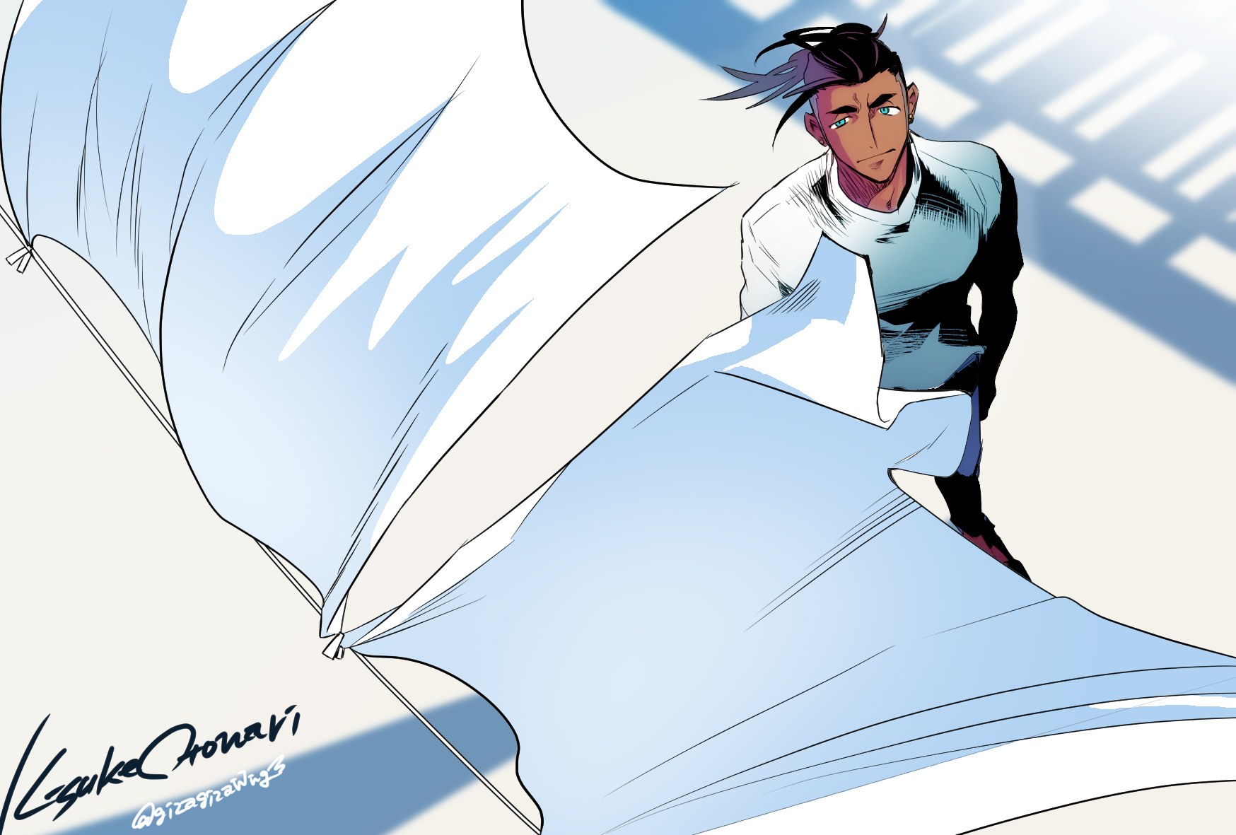 1boy arm_at_side artist_name black_hair clothesline dark-skinned_male dark_skin green_eyes highres laundry male_focus mixed-language_commentary nintendo otona_kasuke pokemon pokemon_sword_and_shield raihan_(pokemon) shadow shirt standing twitter_username white_shirt wind