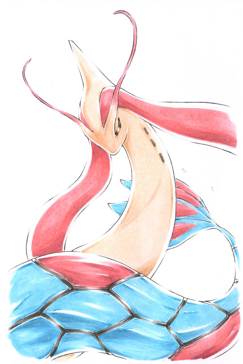 closed_eyes commentary_request facing_viewer gen_3_pokemon marker_(medium) milotic nintendo no_humans pokemon pokemon_(creature) rx79v solo traditional_media white_background