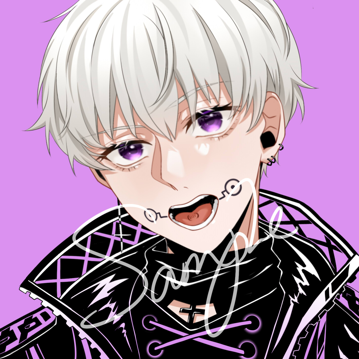 1boy choppy_bangs commentary_request ear_piercing facial_tattoo hair_between_eyes highres inumaki_toge jujutsu_kaisen looking_at_viewer male_focus open_mouth philosophia piercing portrait purple_background purple_eyes sample_watermark short_hair simple_background solo tattoo watermark white_hair
