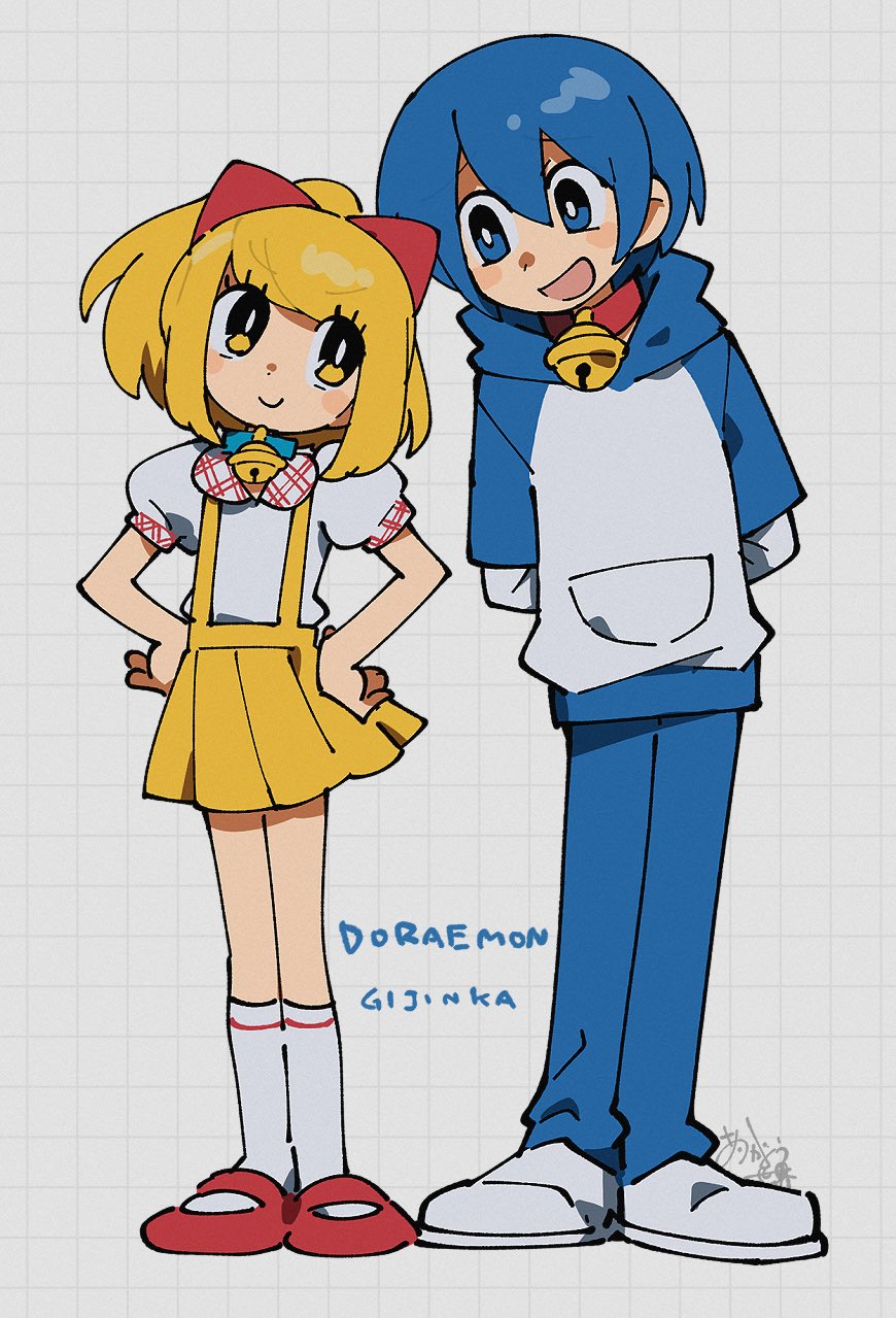 1boy 1girl arms_behind_back bell blonde_hair blue_collar blue_eyes blue_hair blue_pants bright_pupils brown_eyes character_request closed_mouth collar copyright_name doraemon doraemon_(character) highres hood hoodie long_sleeves looking_at_another neck_bell open_mouth pants personification puffy_short_sleeves puffy_sleeves red_collar red_shoes sameyama_jiro shoes short_sleeves simple_background skirt smile suspender_skirt suspenders white_background white_hoodie white_pupils white_shoes yellow_skirt