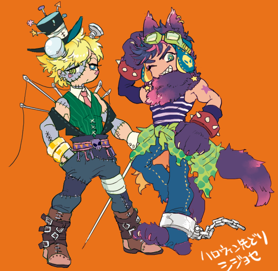 2boys animal_ear_piercing animal_ears animal_feet animal_hands arm_tattoo battle_tendency belt belt_buckle black_hat blonde_hair blue_eyes blue_shirt boots bracelet brown_boots buckle caesar_anthonio_zeppeli chuu_ni collared_shirt commentary_request cuffs full_body goggles goggles_on_head green_eyes green_vest grin halloween halloween_costume hand_in_pocket hat heterochromia jewelry jojo_no_kimyou_na_bouken joseph_joestar joseph_joestar_(young) leg_belt looking_at_viewer male_focus multiple_belts multiple_boys necktie needle object_through_head one_eye_closed orange_background parted_bangs purple_hair red_necktie screw_in_head shackles sharp_teeth shirt short_hair simple_background sleeveless sleeveless_shirt smile spiked_bracelet spikes standing star_(symbol) star_tattoo stitched_face stitches striped_clothes striped_shirt tail tattoo teeth thick_eyebrows thread top_hat torn_clothes translation_request v-shaped_eyebrows vest werewolf_costume white_shirt wing_collar wolf_ears wolf_tail