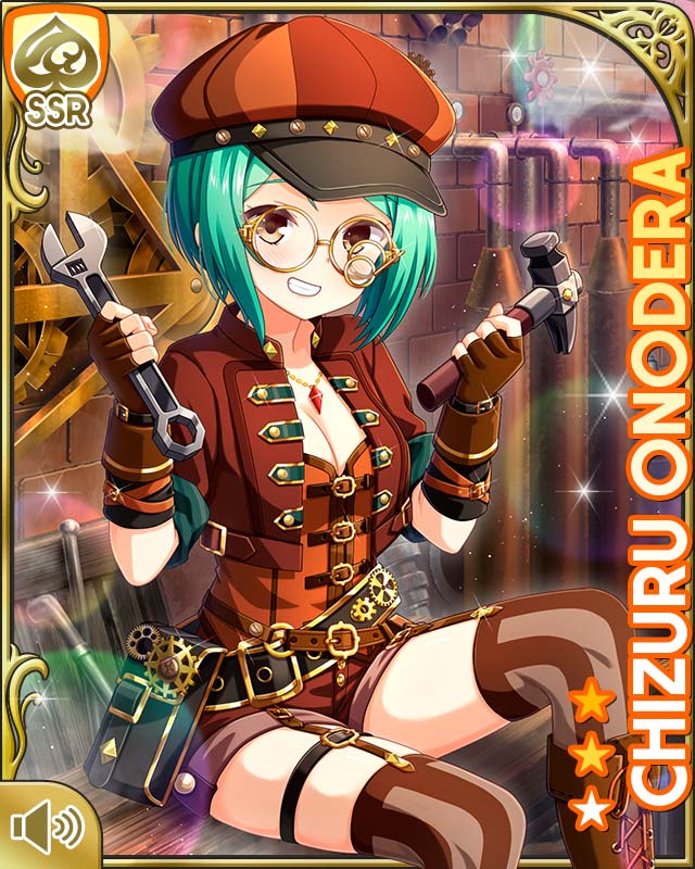 1girl brick_wall brown_eyes brown_gloves brown_hat brown_jacket brown_shorts brown_thighhighs card_(medium) clenched_teeth closed_mouth fingerless_gloves girlfriend_(kari) glasses gloves green_hair hairband hammer hat jacket newsboy_cap official_art onodera_chizuru qp:flapper short_hair shorts sitting smile solo steampunk tank_top teeth thighhighs wrench yellow-framed_eyewear
