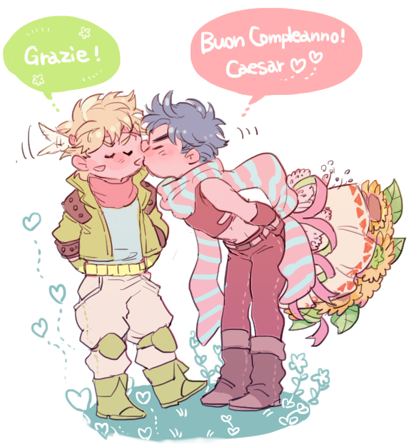 2boys arms_behind_back battle_tendency belt black_hair black_pants black_shirt blonde_hair blue_scarf blush boots bouquet brown_boots caesar_anthonio_zeppeli chuu_ni closed_eyes collared_jacket colored_speech_bubble commentary_request crop_top flower full_body gloves green_boots green_jacket grey_pants headband heart holding holding_bouquet italian_text jacket jojo_no_kimyou_na_bouken joseph_joestar joseph_joestar_(young) kiss kissing_cheek leaf male_focus midriff motion_lines multiple_boys open_clothes open_jacket pants pink_ribbon red_scarf ribbon scarf shirt speech_bubble standing striped_clothes striped_scarf sunflower white_background yaoi
