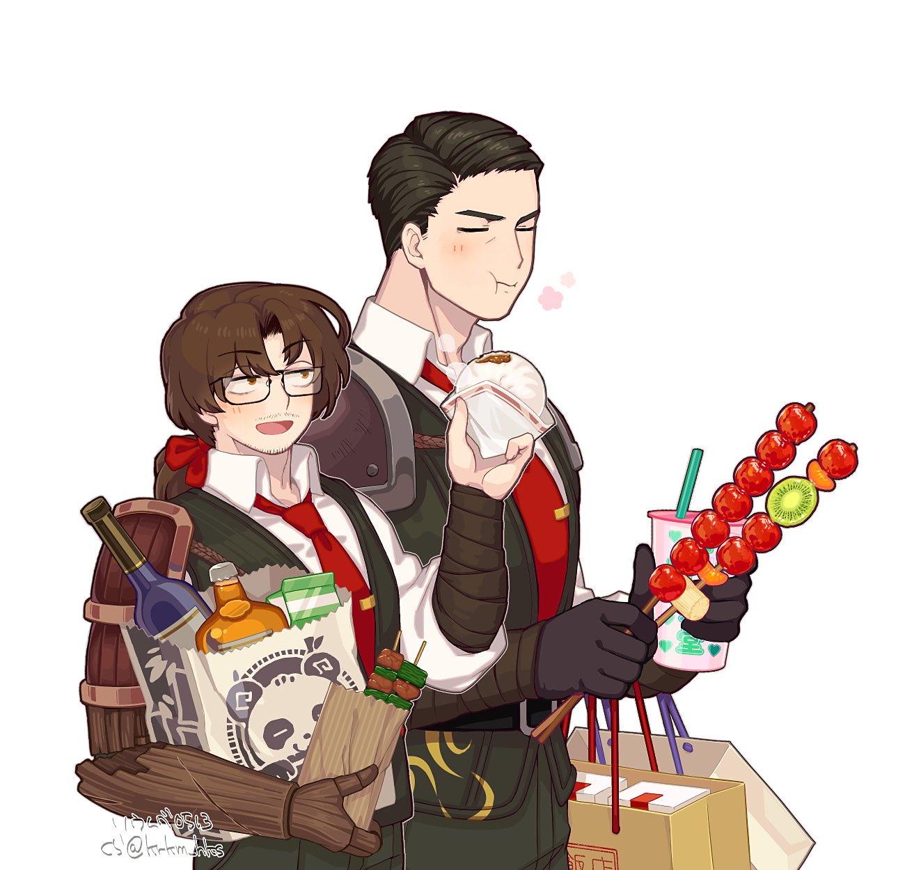 2boys :d :t absurdres alcohol alternate_costume amputee armor artist_name bag bandaged_arm bandages beard_stubble black-framed_eyewear black-framed_glasses black_gauntlets black_hair black_pants black_vest blush bottle bow box brown_eyes brown_hair closed_eyes closed_mouth collared_shirt colored_shoe_soles cup disposable_cup dress_shirt drink drink_carton drinking drinking_straw eating facial_hair food formal_clothes gauntlets glasses gloves gregor_(project_moon) hair_bow hair_ribbon hair_slicked_back happy happy_aura height_difference highres holding holding_bun holding_cup holding_food joints krkm_hks limbus_company liu_association_south_uniform long_hair long_sleeves looking_at_another low_ponytail male_focus mechanical_arms meursault_(project_moon) milk_carton multiple_boys necktie official_alternate_costume open_mouth pants paper_bag parted_bangs pauldrons ponytail project_moon prosthesis prosthetic_arm red_bow red_necktie red_ribbon ribbon semi-rimless_eyewear shirt shopping_bag short_hair shoulder_armor signature simple_background single_mechanical_arm skewer sleeves_rolled_up smile standing steamed_bun strap stubble suit tie_clip tongue twitter_username under-rim_eyewear upper_body vest wagashi white_background white_shirt wine_bottle yellow_eyes
