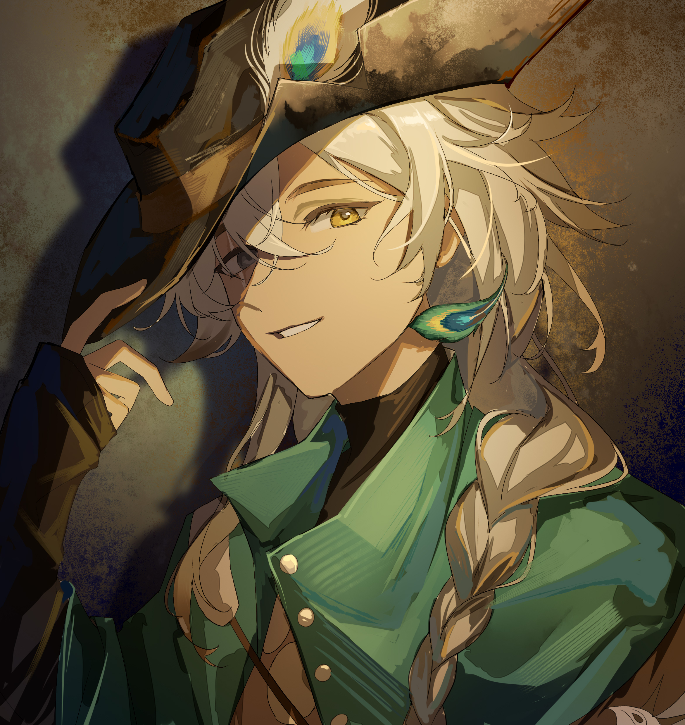 1girl absurdres argus_(reverse:1999) blonde_hair brown_background brown_hat brown_sleeves cape chinese_commentary commentary_request cowboy_hat green_cape grey_eyes grin hand_on_headwear hand_up hat hat_feather highres long_braid looking_at_viewer peacock_feathers portrait ranla reverse:1999 scar scar_across_eye scar_on_face shadow smile solo yellow_eyes