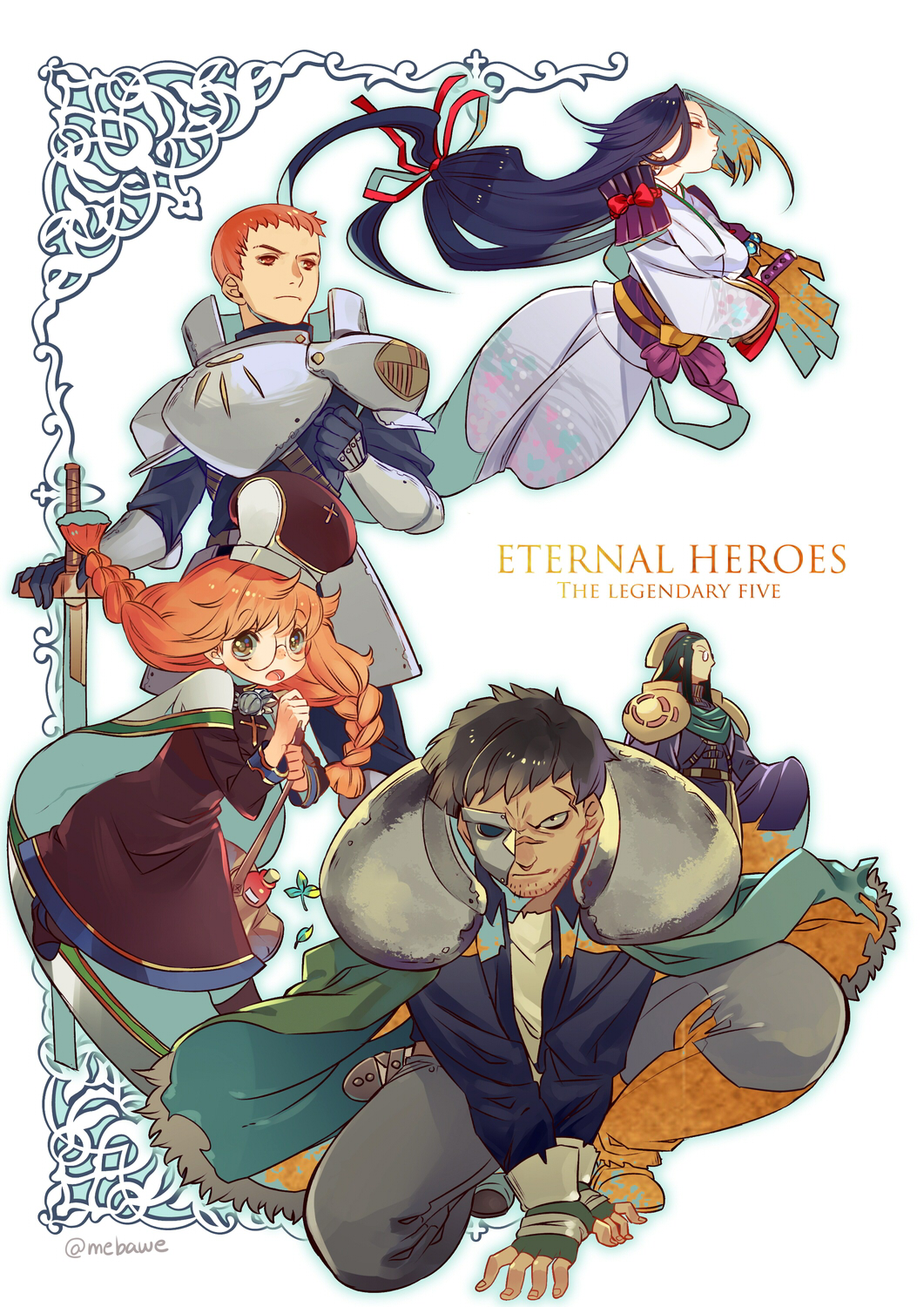 2girls 3boys aqua_cape armor bag beret black_boots black_dress black_eyes black_gloves black_hair black_hat black_jacket black_pants black_shirt boots bottle bow braid breastplate british_(rance) brown_bag brown_eyes brown_hat brown_shoes cafe_artful cape chaos_(rance) closed_mouth commentary_request cross dress english_text faulds fingerless_gloves fur-trimmed_cape fur_trim gloves green_cape green_gloves grey_pants hair_ribbon half_mask hat hayasaka_mebawe highres ho_laga holding_strap jacket japanese_clothes kimono leaf light_smile long_hair looking_at_viewer low-tied_long_hair low_twin_braids mask multiple_boys multiple_girls nikkou_(rance_series) obi on_one_knee open_clothes open_jacket orange_hair pants pauldrons pink_bow purple_sash rance_(series) red_eyes red_hair red_ribbon ribbon sash scar scar_on_face scar_on_forehead scar_on_nose sheath sheathed shirt shoes short_hair shoulder_armor shoulder_bag sleeve_cuffs standing sword sword_on_back twin_braids twitter_username two-sided_cape two-sided_fabric vambraces very_long_hair weapon weapon_on_back white_background white_cape white_kimono white_shirt
