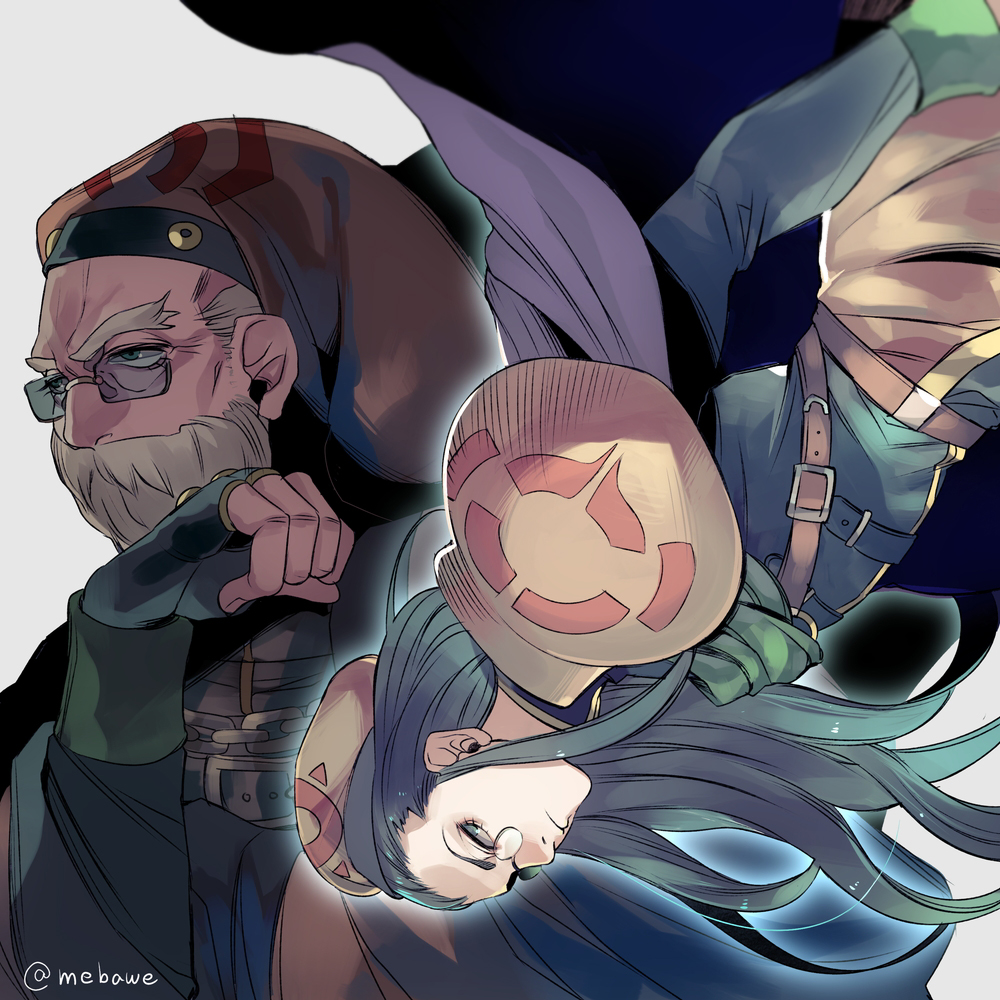 2boys age_comparison armor beard belt belt_buckle beret black_cape black_gloves black_hair black_pants black_shirt blue_eyes brown_belt brown_hat brown_pants buckle cape closed_mouth commentary_request facial_hair fingerless_gloves glasses gloves hand_up hat hayasaka_mebawe ho_laga long_hair looking_at_viewer male_focus multiple_boys old old_man pants pauldrons rance_(series) round_eyewear shirt short_hair shoulder_armor twitter_username two-sided_cape two-sided_fabric two-tone_pants upside-down white_cape white_hair