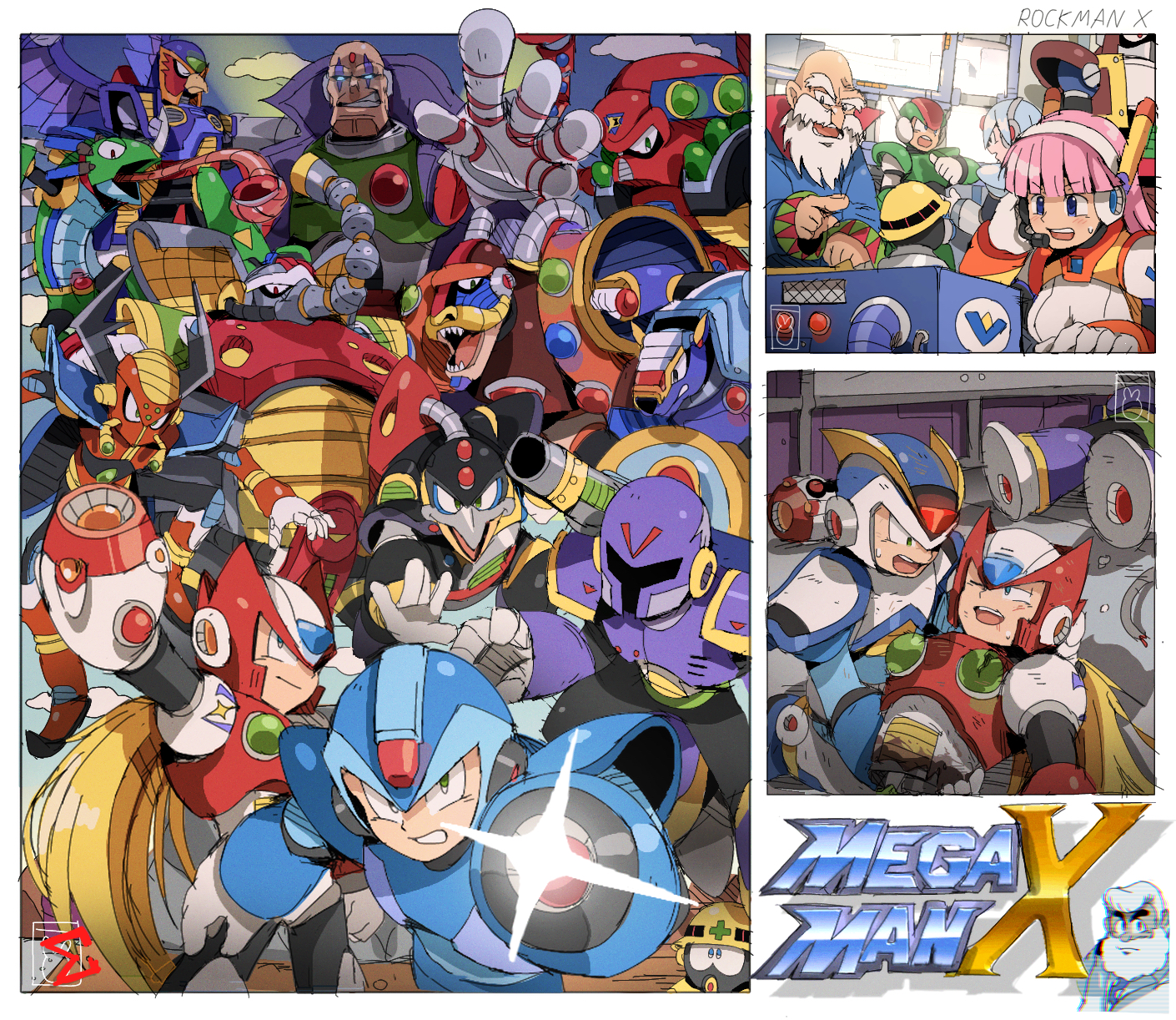 1girl 6+boys android arm_cannon armored_armadillo_(mega_man) bald bendedede blonde_hair boomer_kuwanger_(mega_man) chill_penguin_(mega_man) clenched_teeth commentary dr._cain_(mega_man) dr._light_(mega_man) english_commentary english_text evil_smile flame_mammoth_(mega_man) green_biker_dude_(mega_man) grey_hair helmet highres launch_octopus_(mega_man) mega_man_(series) mega_man_x1 mega_man_x_(series) met_(mega_man) multiple_boys navigator_(mega_man) non-humanoid_robot old old_man robot robot_animal sigma_(mega_man) sigma_symbol smile spark_mandrill_(mega_man) sting_chameleon_(mega_man) storm_eagle_(mega_man) teeth vile_(mega_man) weapon x_(mega_man) zero_(mega_man)