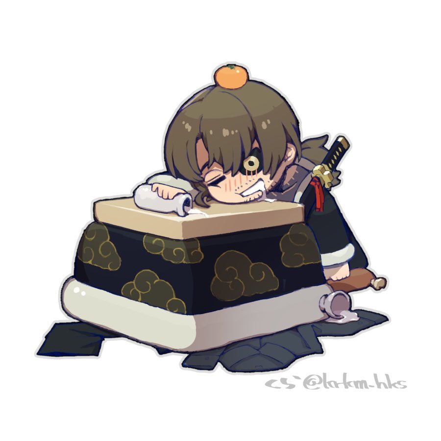 1boy absurdres alcohol beard_stubble black_hair black_kimono black_shirt blush bottle brown_hair chibi closed_eyes collared_shirt cup cushion drooling drunk eyepatch facial_hair food food_on_head fruit full-body_tattoo full_body gregor_(project_moon) grin hair_between_eyes hand_on_hilt hanten_(clothes) highres japanese_clothes katana kimono kotatsu krkm_hks kurokumo_clan_(identity)_(project_moon) leaning_forward limbus_company long_hair long_sleeves low_ponytail lying male_focus mandarin_orange mouth_drool neck_tattoo object_on_head on_pillow one-eyed open_mouth orange_(fruit) parted_bangs photoshop_(medium) pillow ponytail project_moon sakazuki sake sake_bottle saliva scabbard shaded_face sheath sheathed shirt simple_background sitting sleeping smile solo spilled_drink stubble sword table tattoo tattoo_on_neck tokkuri twitter_username unworn_shirt weapon white_background white_trim