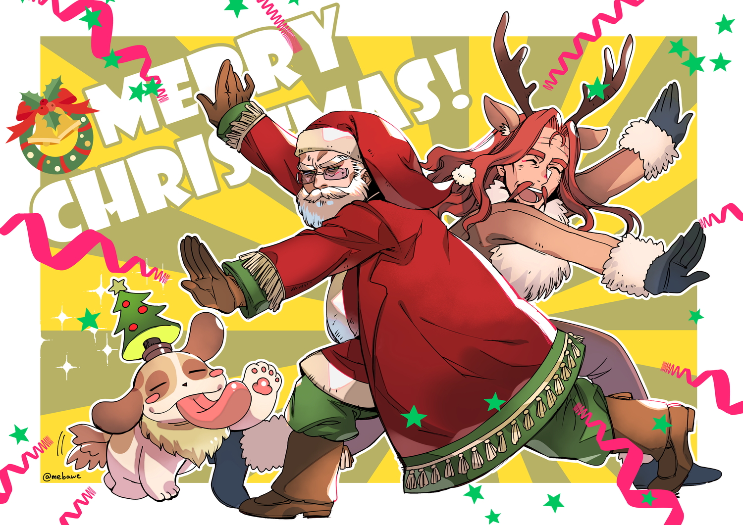 2boys ^_^ animal_costume animal_ears antlers beard bell black_gloves bodysuit boots british_(rance) brown_bodysuit brown_boots christmas christmas_tree christmas_tree_hat closed_eyes coat commentary_request curtained_hair deer_ears facial_hair fake_animal_ears fake_antlers fur-trimmed_bodysuit fur-trimmed_coat fur-trimmed_headwear fur_collar fur_trim glasses gloves green_eyes green_pants hat hayasaka_mebawe ho_laga horns leaning_forward legs_apart long_hair looking_at_viewer looking_to_the_side male_focus merry_christmas multiple_boys mustache old old_man open_mouth outstretched_arms pants rance_(series) red_coat red_hair red_hat red_ribbon reindeer_antlers reindeer_costume ribbon santa_costume santa_hat short_hair smile standing star_(symbol) sunburst tassel teeth tongue tongue_out twitter_username upper_teeth_only white_hair wreath
