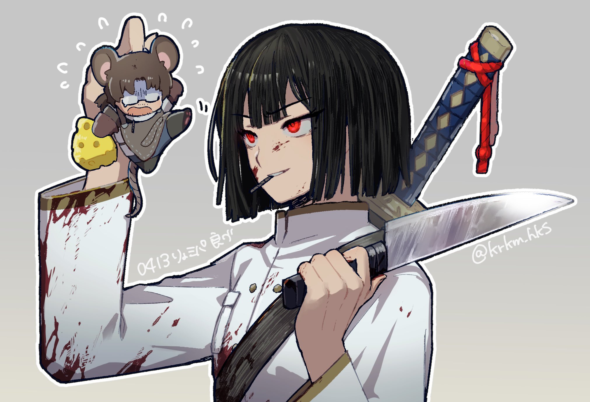 1boy 1girl absurdres alternate_costume amputee animal animal_ears apron apron_pocket artist_name beard_stubble black-framed_eyewear black-framed_glasses black_boots black_hair blood blood_on_clothes blood_on_face blood_splatter blood_stain blue_pants blunt_bangs blunt_ends bob_cut boots brown_apron brown_gloves brown_hair cheese chibi chibi_inset cigarette dagger elbow_gloves facial_hair flying_sweatdrops food full_body glasses gloves gregor_(project_moon) grey_background grin hands_up highres holding holding_chibi holding_food holding_knife holding_mini_person holding_weapon jacket joints katana knife krkm_hks limbus_company long_hair long_sleeves looking_at_another looking_to_the_side low_ponytail mechanical_arms mini_person miniboy motion_lines mouse_boy mouse_ears mouse_tail mouth_hold official_alternate_costume open_mouth outline pale_skin pants parted_bangs parted_lips paw_shoes ponytail project_moon prosthesis prosthetic_arm r.b._(identity)_(project_moon) red_eyes ryoshu_(project_moon) scabbard semi-rimless_eyewear shaded_face sheath sheathed short_hair simple_background single_mechanical_arm smile smirk smoking stubble sweat sweatdrop sweater swiss_cheese sword tail teardrop-framed_glasses teeth turn_pale turtleneck turtleneck_sweater twitter_username under-rim_eyewear upper_body weapon weapon_on_back white_jacket white_outline white_pants white_sweater