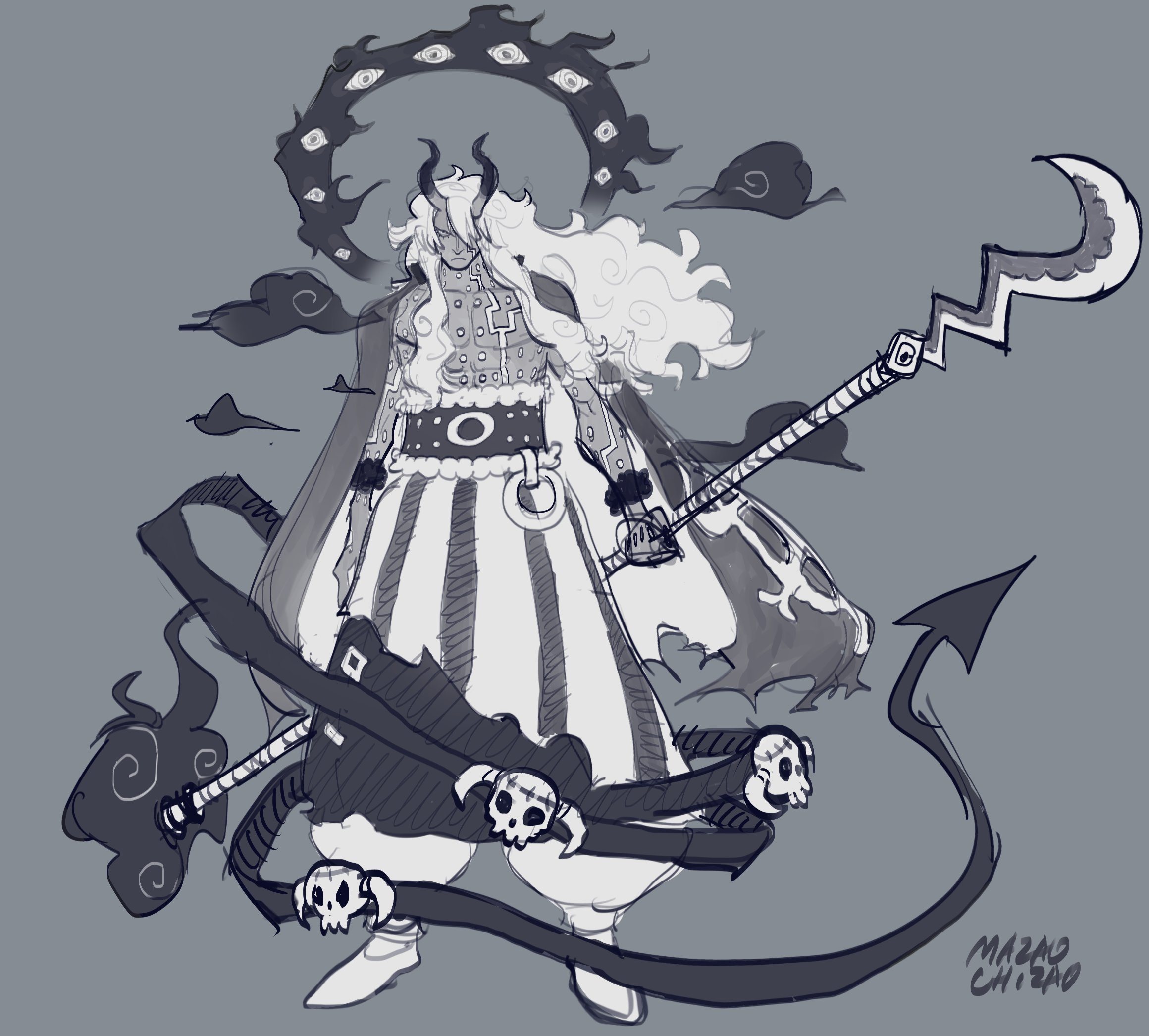 1boy abs demon_horns full_body grey_background hair_over_one_eye highres holding holding_weapon horns imu_(one_piece) long_hair looking_up mazaochizao monochrome muscular nerona_imu one_eye_covered one_piece pectorals serious veil weapon
