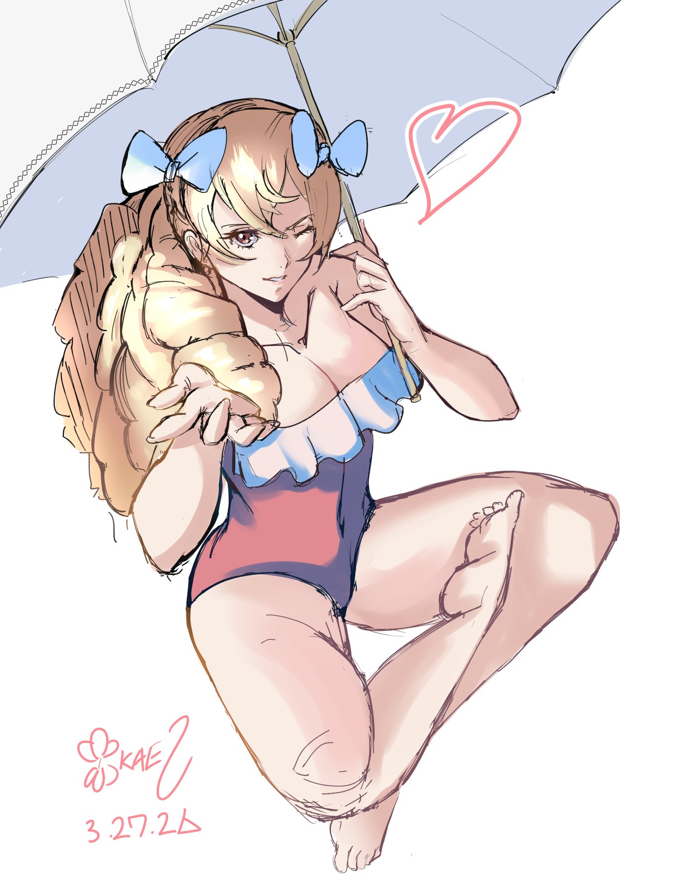 1girl blonde_hair blue_eyes bow breasts cleavage drill_hair fire_emblem fire_emblem_awakening hair_bow heart lace_trim looking_at_viewer maribelle_(fire_emblem) medium_breasts nintendo one-piece_swimsuit one_eye_closed parasol sitting solo swimsuit umbrella wink yoltablaze