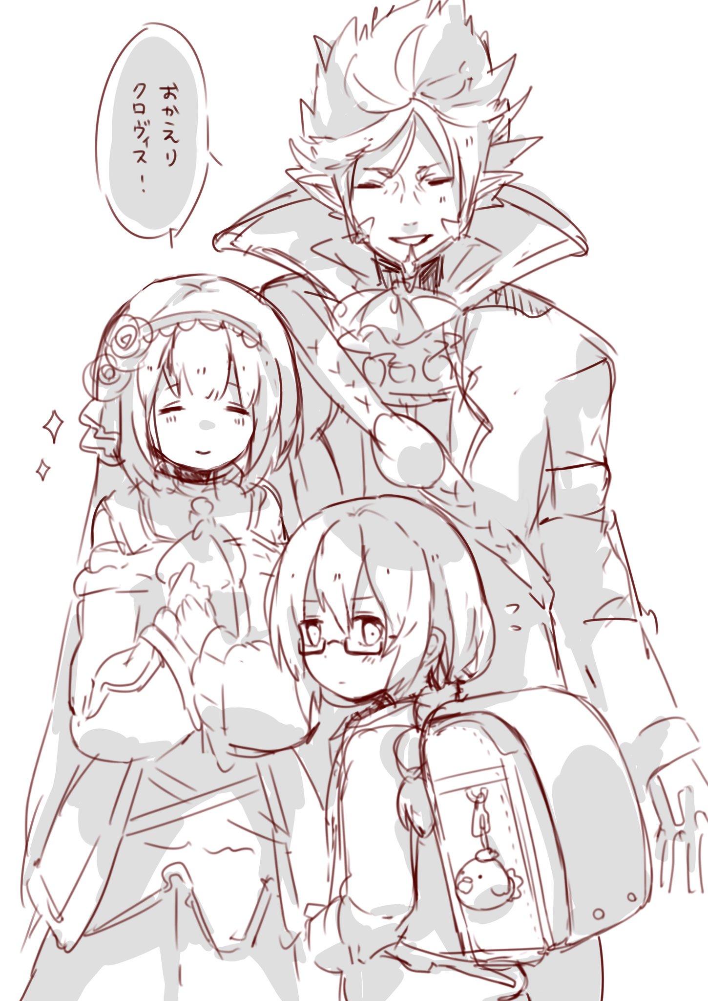 1girl 2boys aged_down alternate_costume ascot az_9649 backpack bag bare_shoulders child closed_eyes closed_mouth clovis_(grimms_notes) coat detached_sleeves dress gilles_de_rais_(aohige)_(grimms_notes) gilles_de_rais_(grimms_notes) glasses grimms_notes grin highres jeanne_d'arc_(grimms_notes) jeanne_d'arc_(seijo)_(grimms_notes) long_sleeves looking_at_viewer multiple_boys pointy_ears puffy_long_sleeves puffy_sleeves simple_background smile speech_bubble standing teeth translation_request white_background