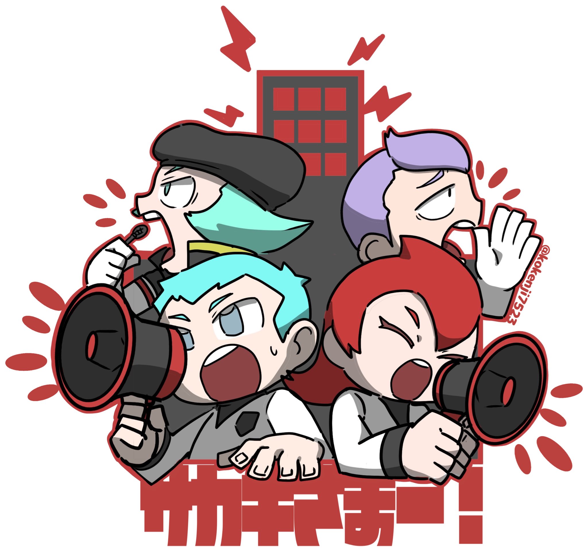 1girl 3boys aqua_eyes aqua_hair archer_(pokemon) ariana_(pokemon) black_hat building closed_eyes commentary_request eyelashes fingernails gloves grey_eyes hat highres holding holding_megaphone holding_microphone kokenji7523 lightning_bolt_symbol long_hair long_sleeves megaphone microphone multiple_boys nintendo open_mouth outline petrel_(pokemon) pokemon pokemon_heartgold_and_soulsilver proton_(pokemon) purple_hair red_hair red_outline short_hair sweatdrop team_rocket team_rocket_uniform teeth translation_request twitter_username upper_teeth_only white_background white_gloves