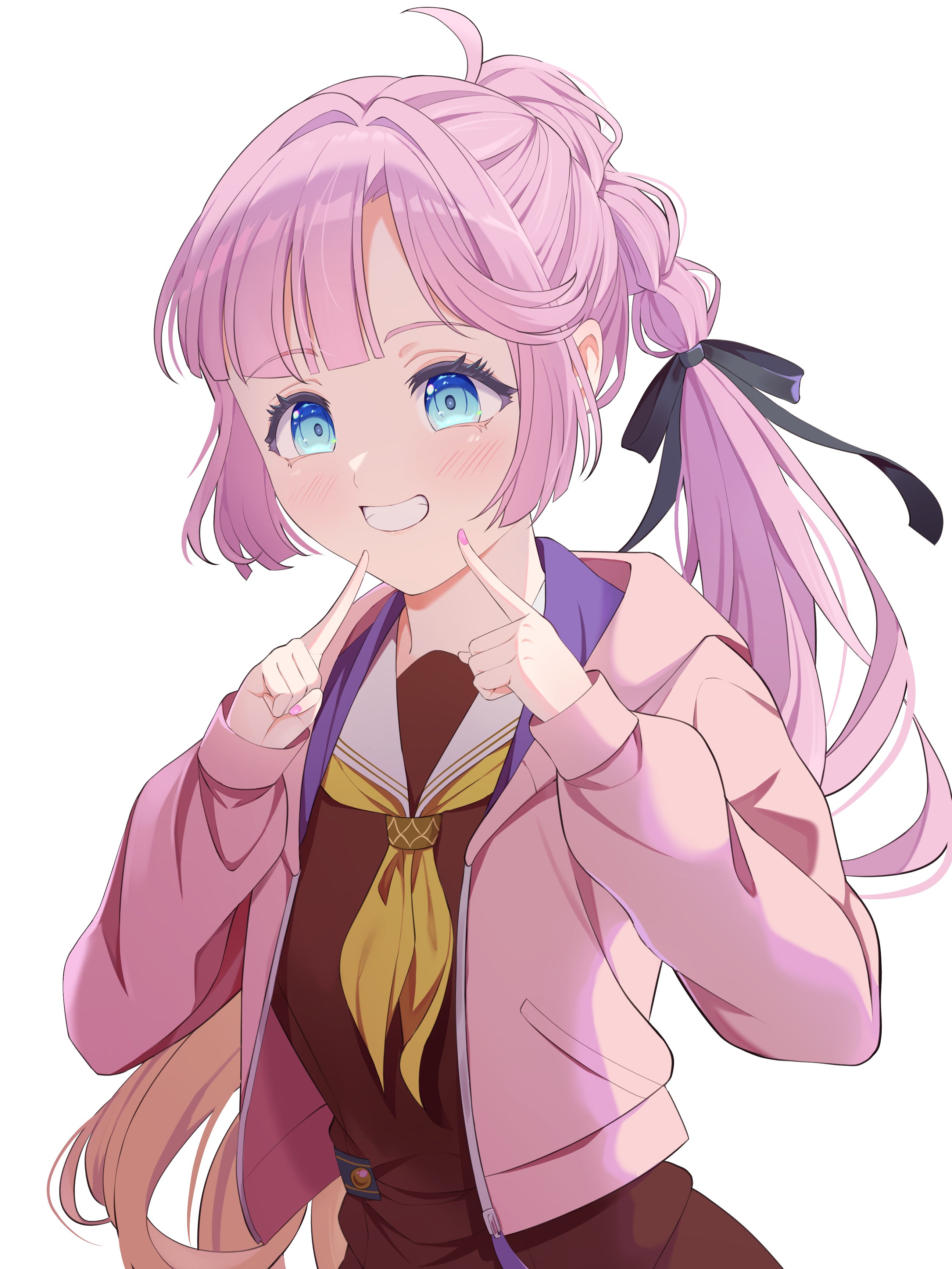 1girl absurdres ahoge anyoji_hime black_ribbon blonde_hair blue_eyes brown_dress commentary dress fingers_to_cheeks gradient_hair hair_ribbon hasu_no_sora_school_uniform highres hood hood_down hooded_jacket jacket link!_like!_love_live! long_hair long_sleeves love_live! multicolored_hair neckerchief open_clothes open_jacket pink_hair pink_jacket ribbon sailor_collar sailor_dress school_uniform simple_background solo upper_body very_long_hair virtual_youtuber white_background white_sailor_collar winter_uniform yellow_neckerchief zuki_ccsd