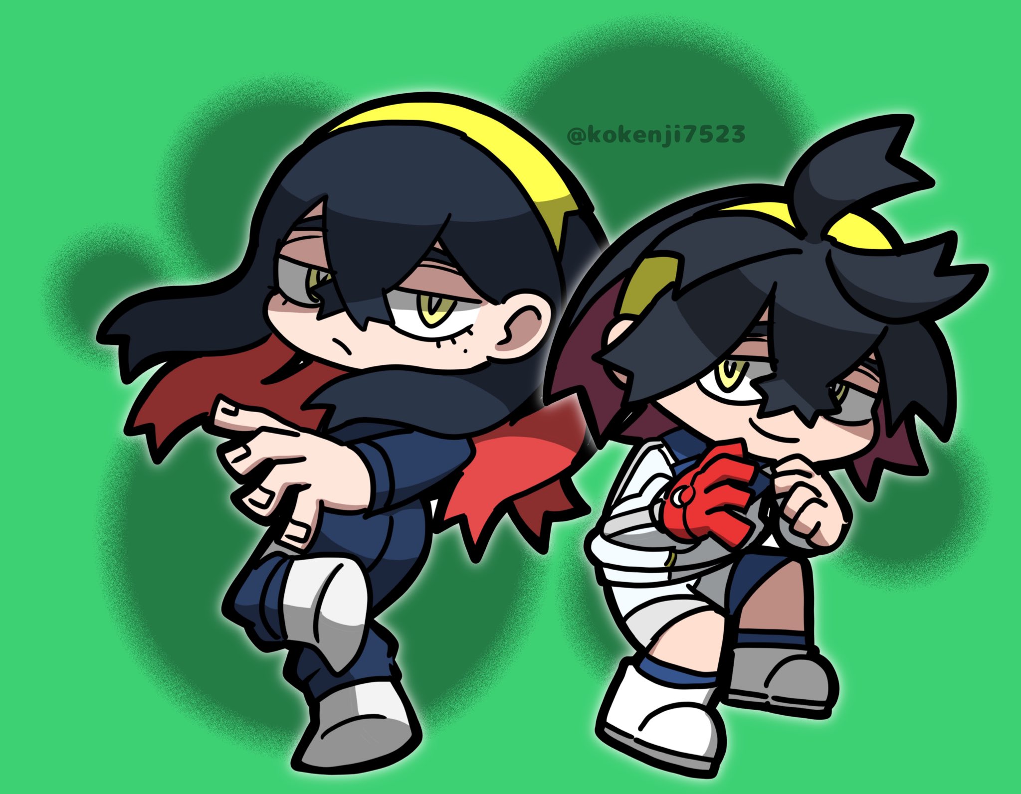 1boy 1girl black_hair blue_pants blue_shirt blue_socks blueberry_academy_school_uniform bright_pupils carmine_(pokemon) chibi chibi_only closed_mouth colored_inner_hair commentary_request crossed_bangs eyelashes fingernails full_body gloves green_background hair_between_eyes hairband highres kieran_(pokemon) kokenji7523 long_hair long_sleeves mole mole_under_eye multicolored_hair nintendo pants pokemon pokemon_scarlet_and_violet purple_hair red_gloves red_hair school_uniform shadow shirt shoes shorts siblings simple_background single_glove smile socks standing standing_on_one_leg twitter_username two-tone_hair white_pupils white_shirt white_shoes white_shorts yellow_eyes yellow_hairband