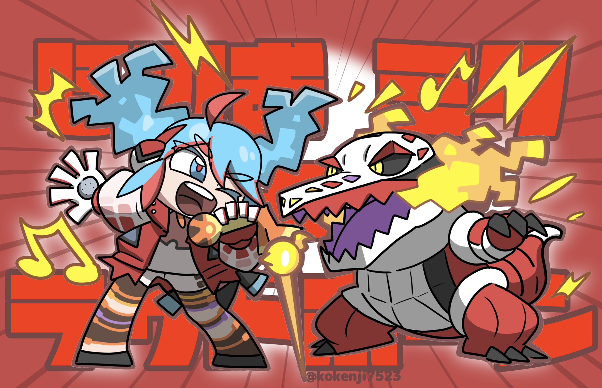 1girl ahoge aqua_eyes black_sclera brown_outline claws colored_sclera commentary_request eyelashes fire fire_miku_(project_voltage) floating_hair hair_between_eyes hatsune_miku highres holding jacket kokenji7523 long_hair long_sleeves multicolored_hair music musical_note nintendo one_eye_closed open_clothes open_jacket open_mouth outline pokemon pokemon_(creature) project_voltage red_background red_hair red_jacket red_pupils singing skeledirge smile standing teeth twintails twitter_username two-tone_hair upper_teeth_only vocaloid yellow_eyes